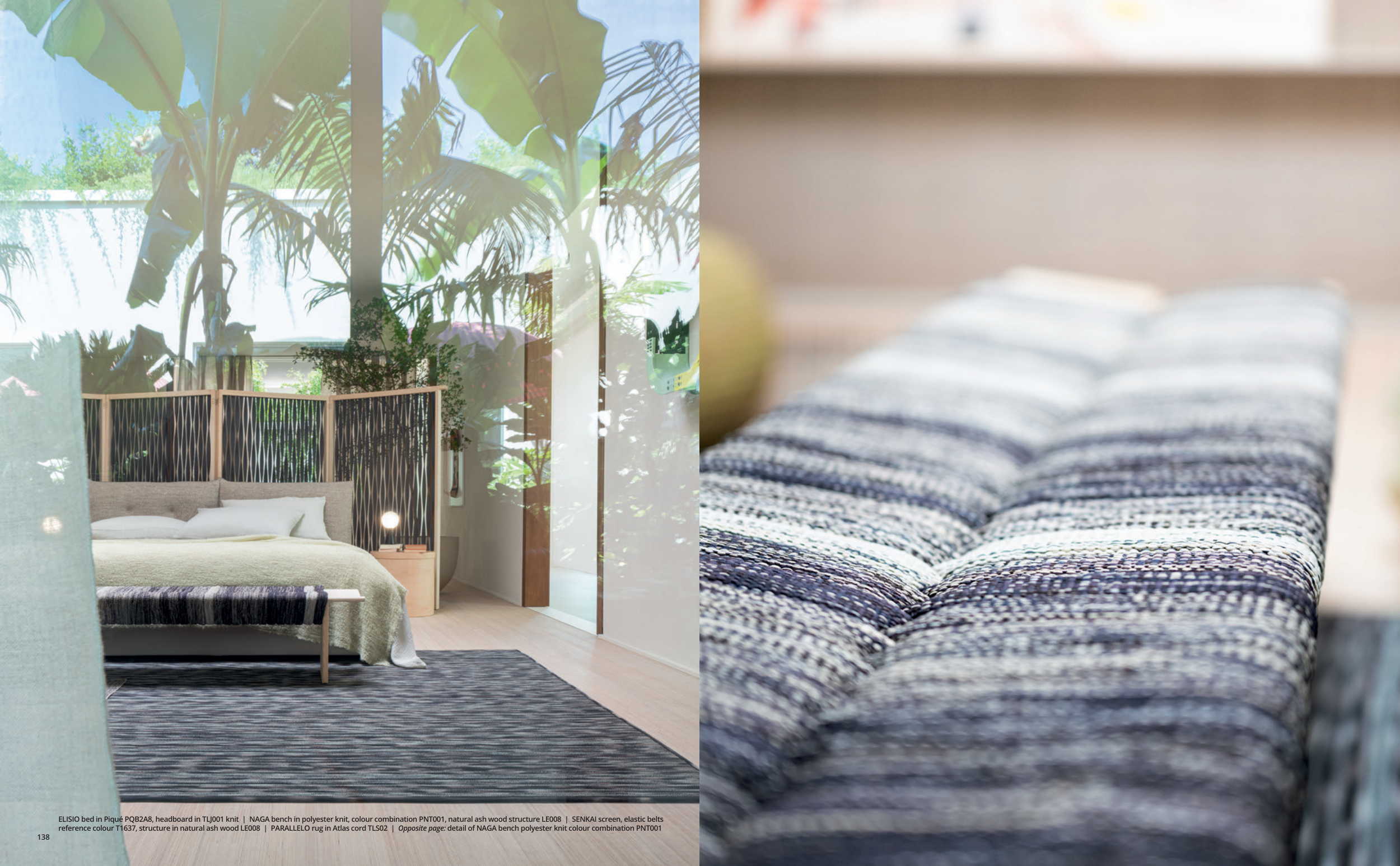 reference colour T1637, structure in natural ash wood LE008 | PARALLELO rug in Atlas cord TLS02 | Opposite page: detail of NAGA bench polyester knit colour combination PNT001