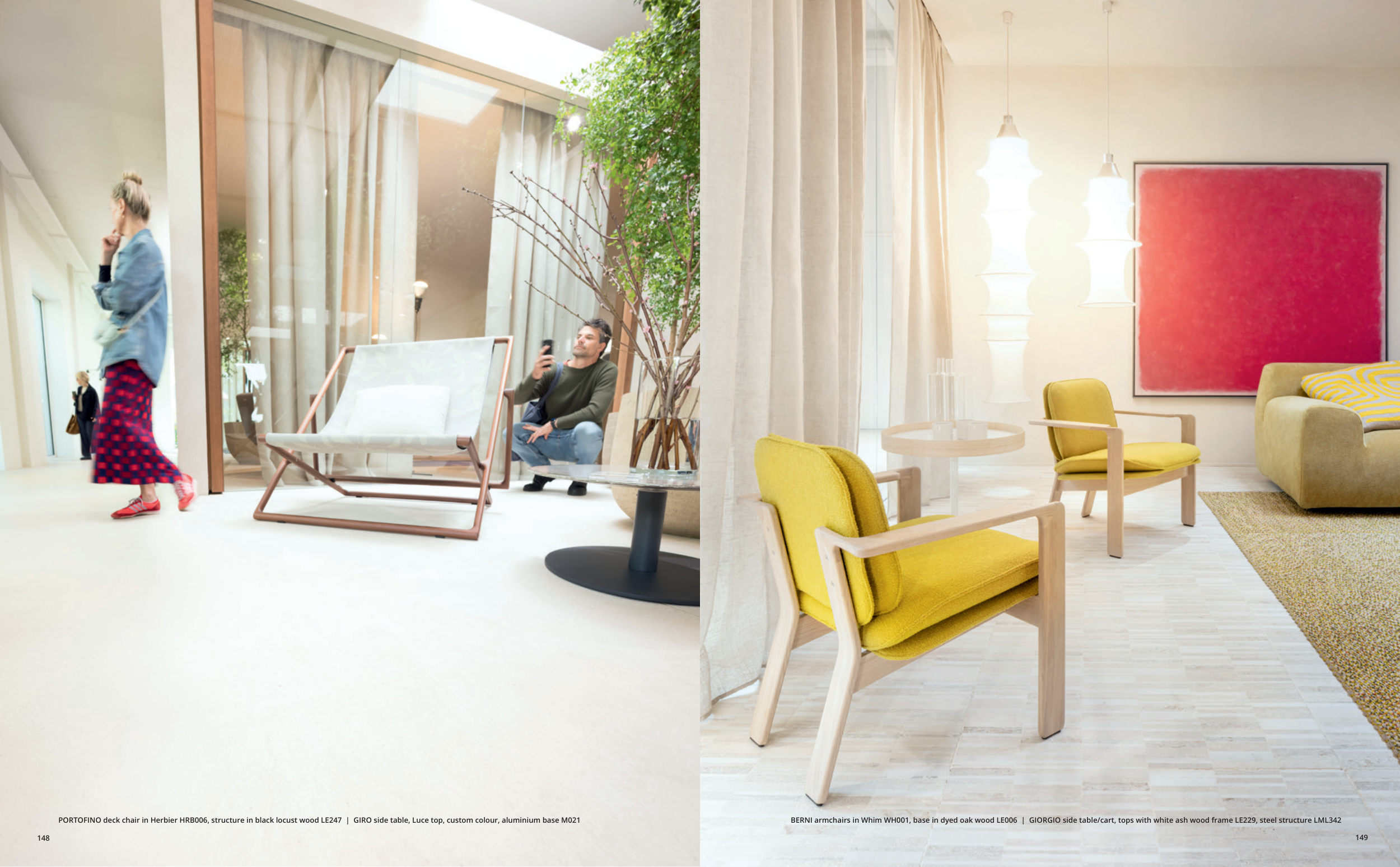 BERNI armchairs in Whim WH001, base in dyed oak wood LE006 | GIORGIO side table/cart, tops with white ash wood frame LE229, steel structure LML342