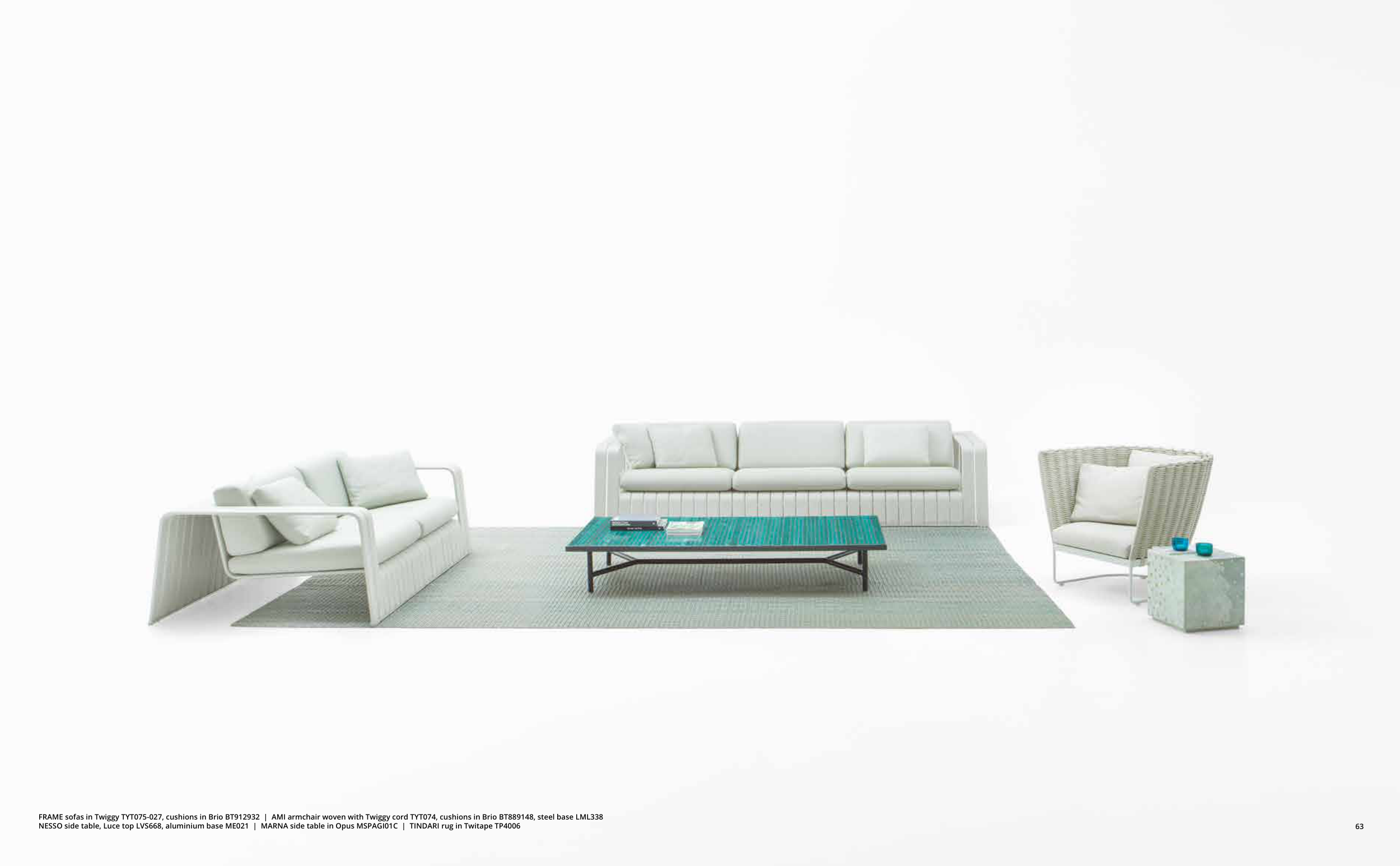 FRAME sofas in Twiggy TYT075-027, cushions in Brio BT912932 | AMI armchair woven with Twiggy cord TYT074, cushions in Brio BT889148, steel base LML338
