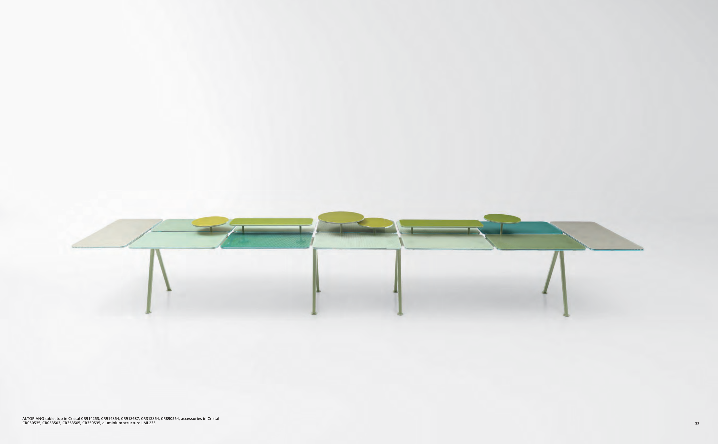 ALTOPIANO table, top in Cristal CR914253, CR914854, CR918687, CR312854, CR890554, accessories in Cristal