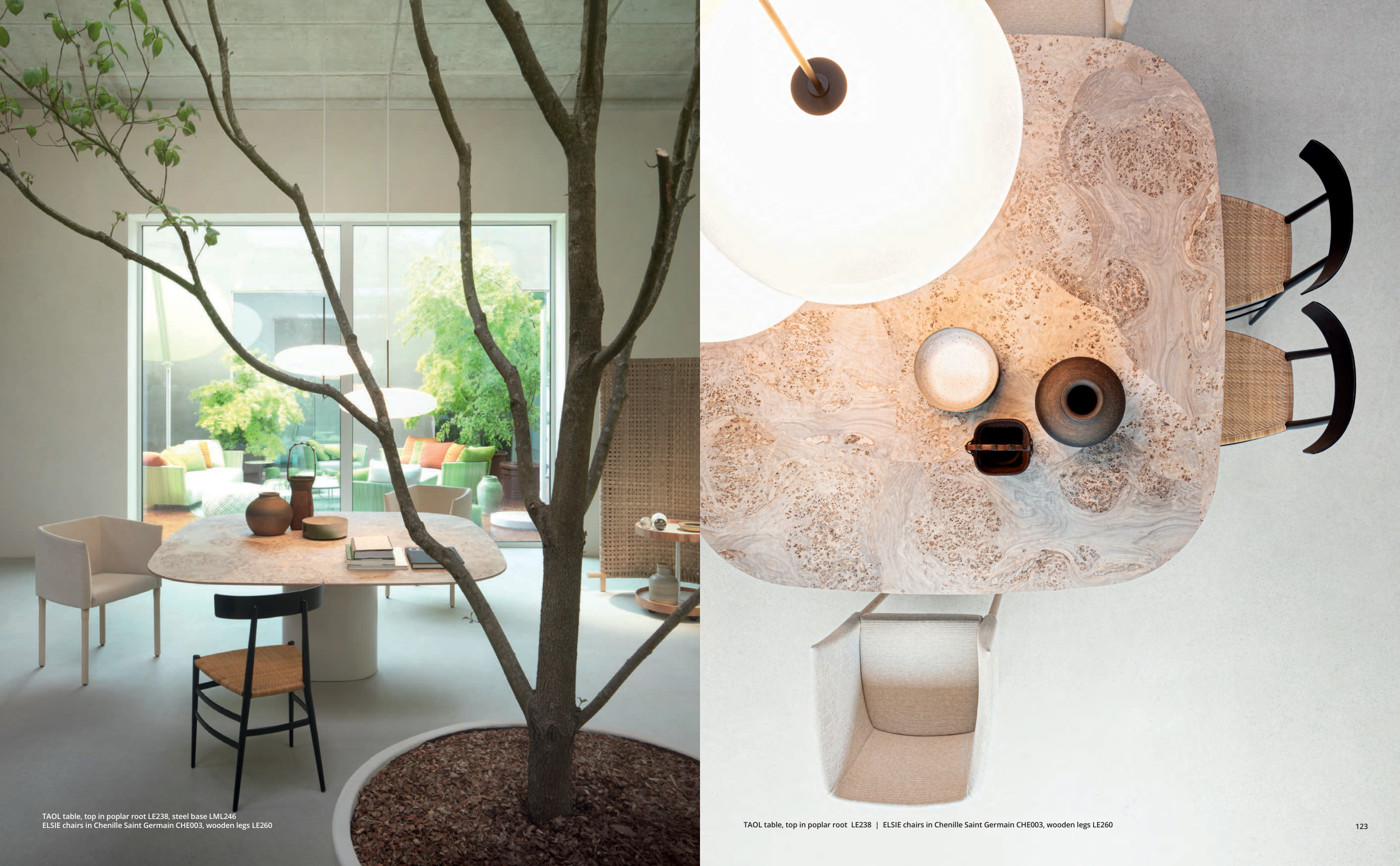 TAOL table, top in poplar root LE238 | ELSIE chairs in Chenille Saint Germain CHE003, wooden legs LE260