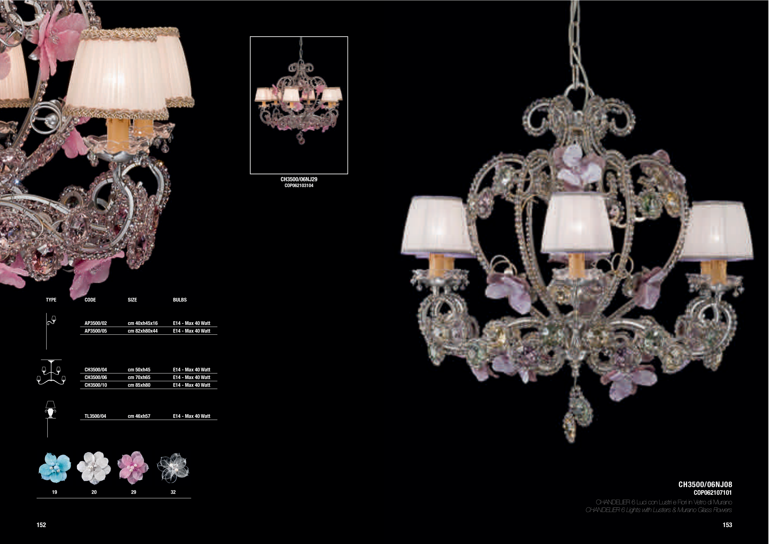 CHANDELIER 6 Lights with Lusters & Murano Glass Flowers