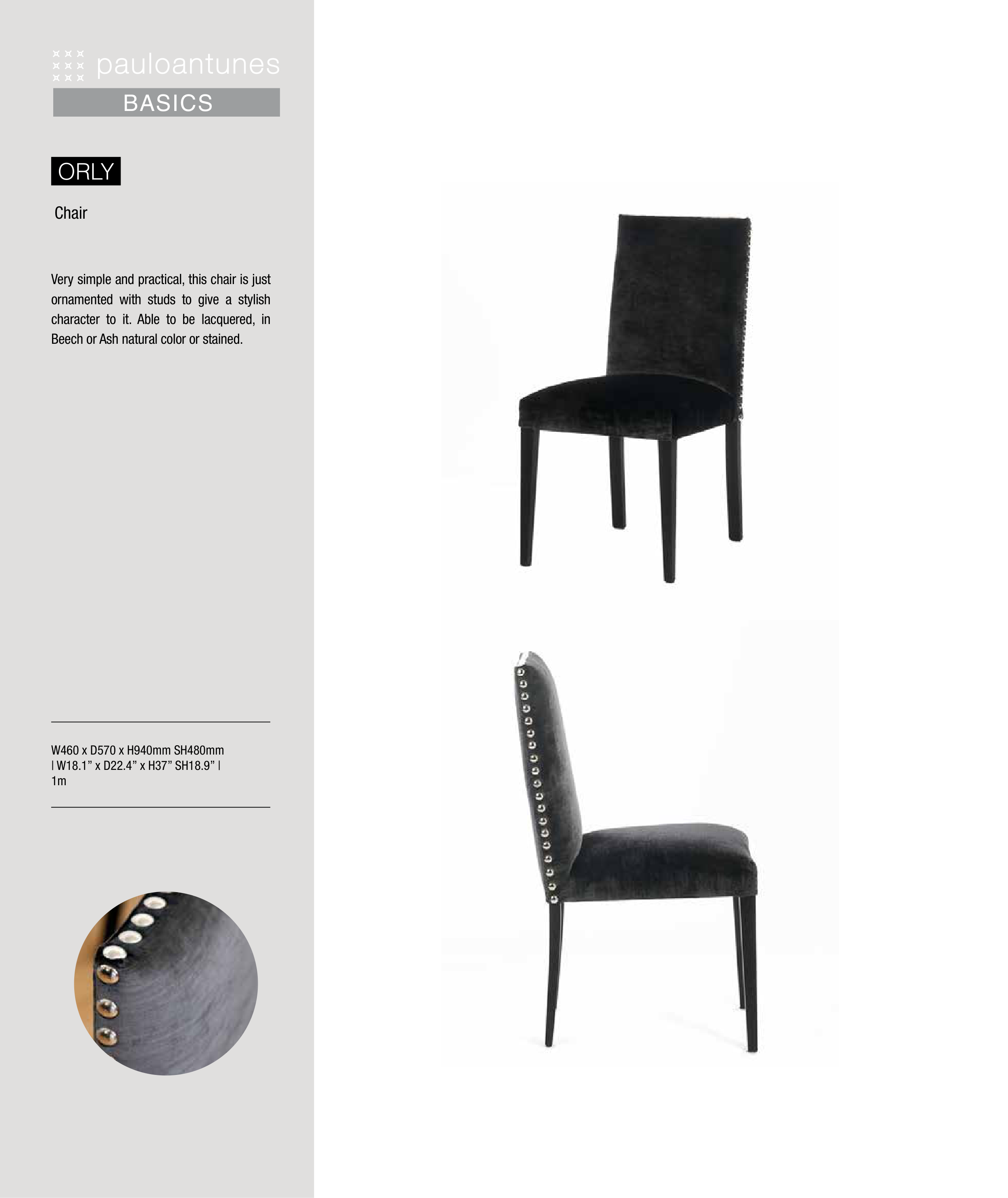 BASICS ORLY Chair Very simple and practical, this chair is just ornamented with studs to give a stylish character to it. Able to be lacquered, in Beech or Ash natural color or stained. W460 x D570 x H940mm SH480mm | W18.1” x D22.4” x H37” SH18.9” | 1m