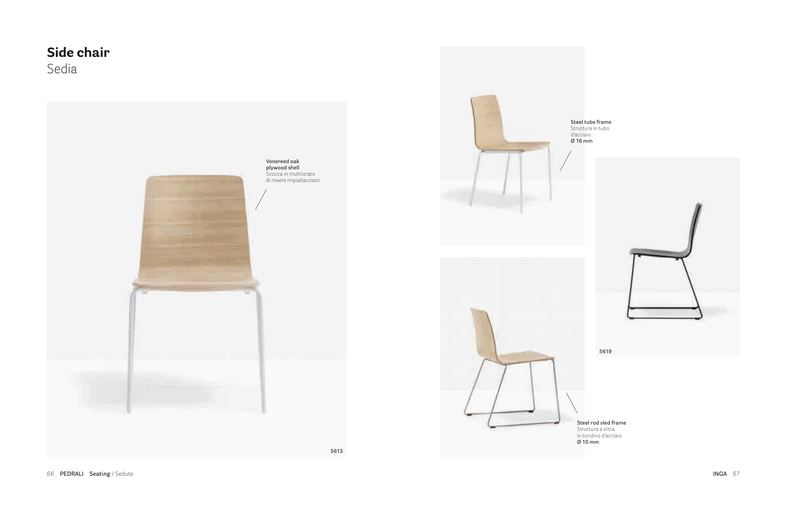 INGA 67 66 PEDRALI Seating / Sedute Side chair Sedia 5613 Venereed oak plywood shell Scocca in multistrato di rovere impiallacciato 5619 Steel rod sled frame Struttura a slitta in tondino d’acciaio Ø 10 mm Steel tube frame Struttura in tubo d’acciaio Ø 16 mm