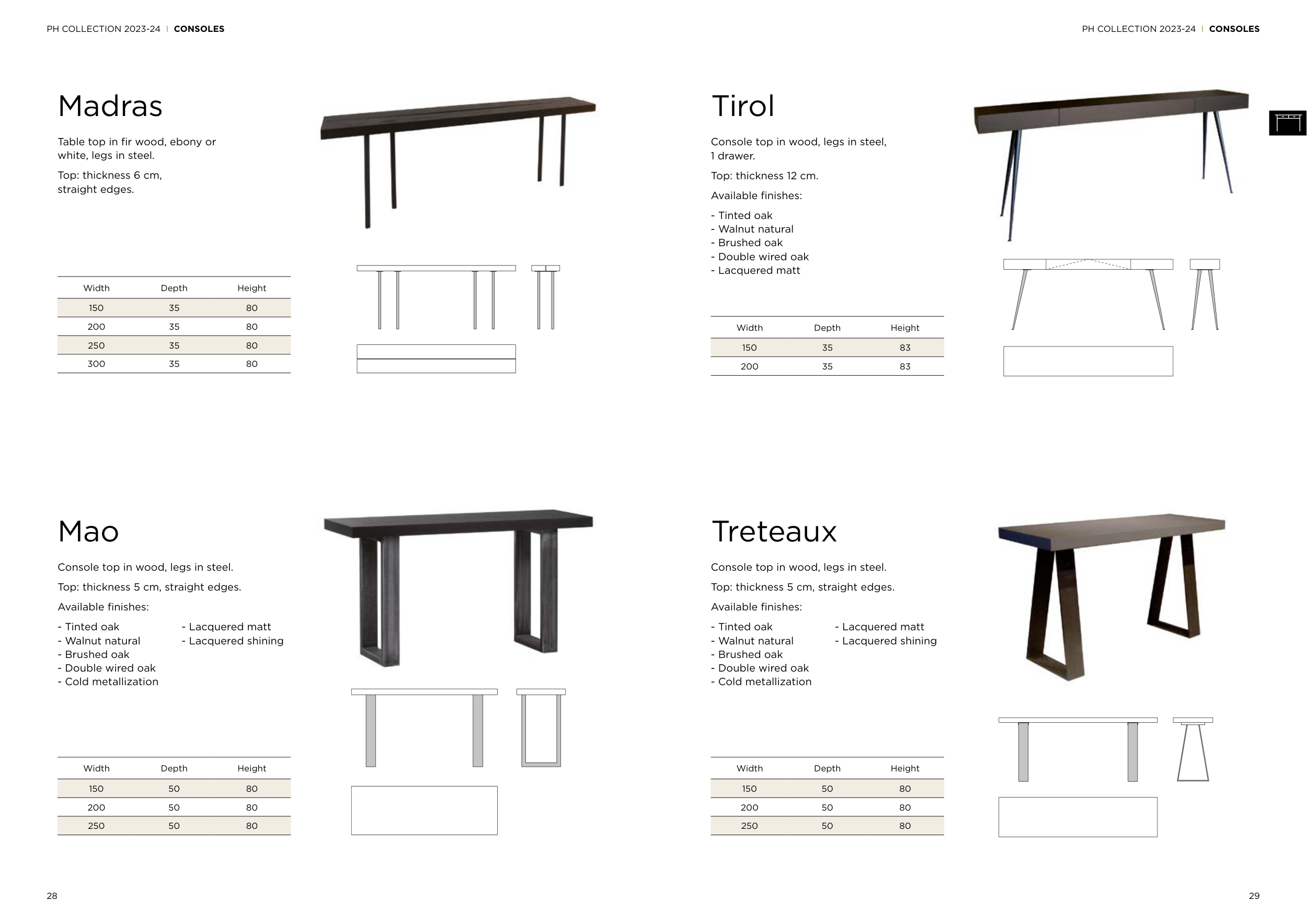 Console top in wood, legs in steel.