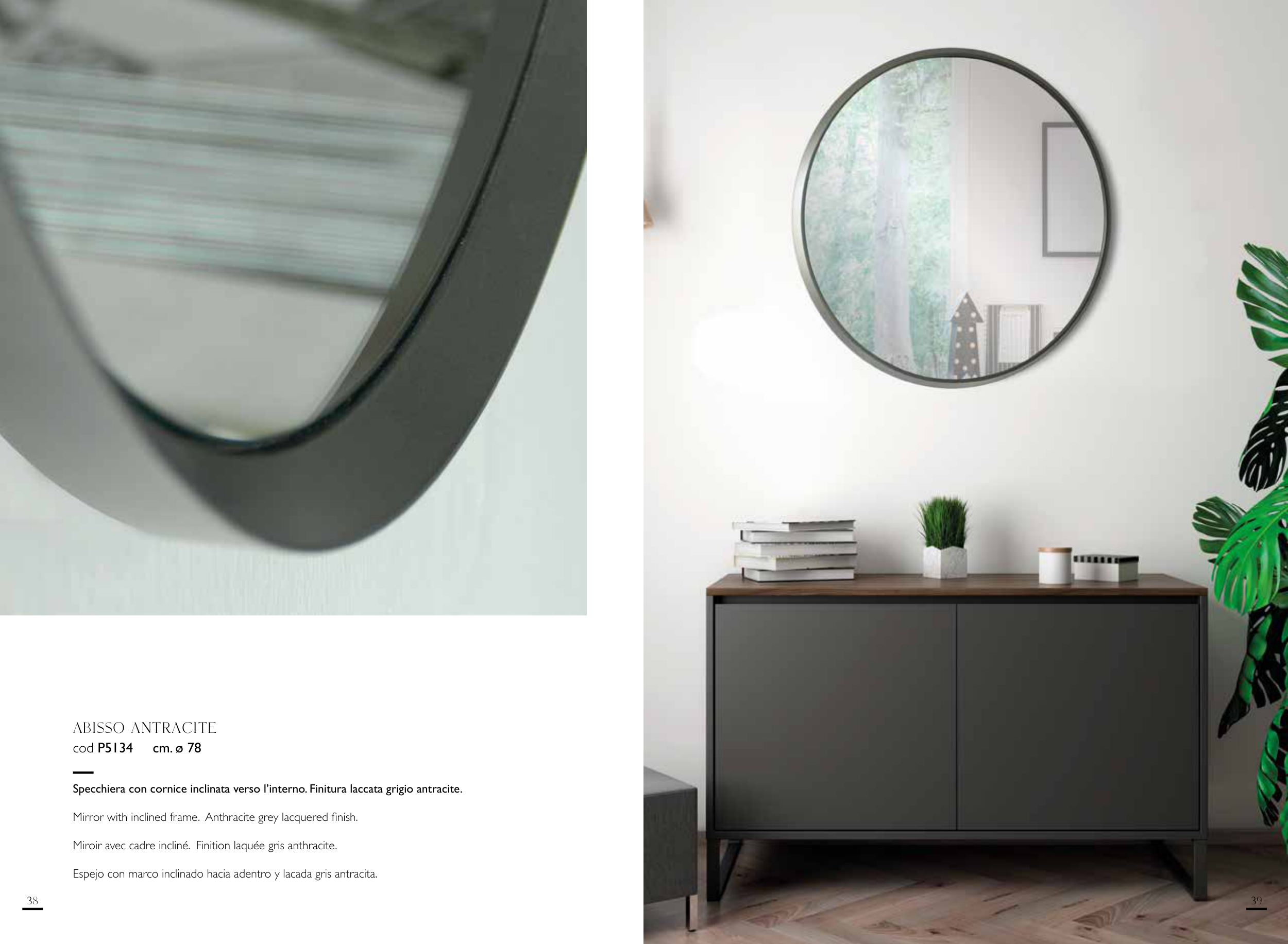 Specchiera con cornice inclinata verso l’interno. Finitura laccata grigio antracite.