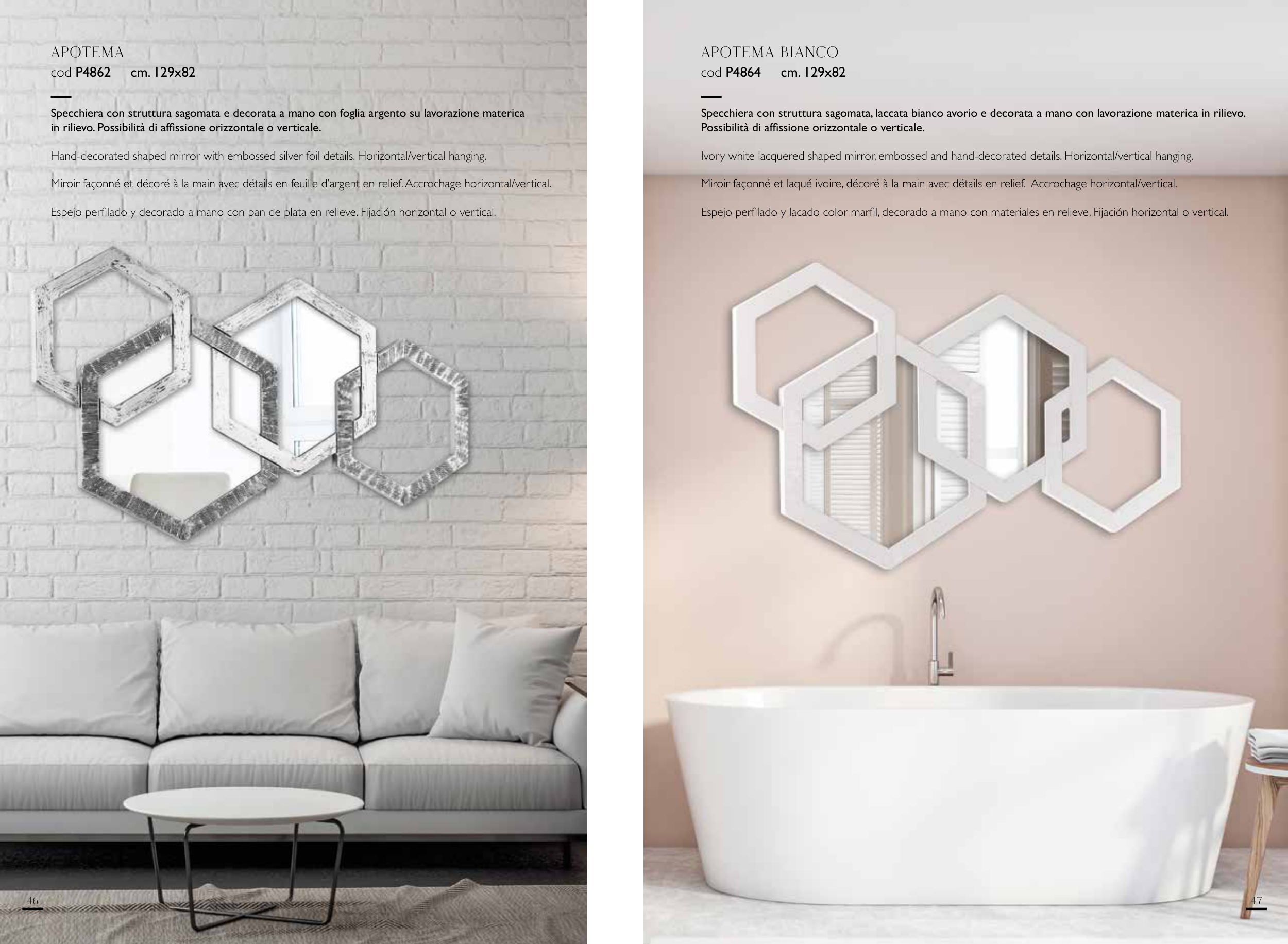Miroir façonné et décoré à la main avec détails en feuille d’argent en relief. Accrochage horizontal/vertical.