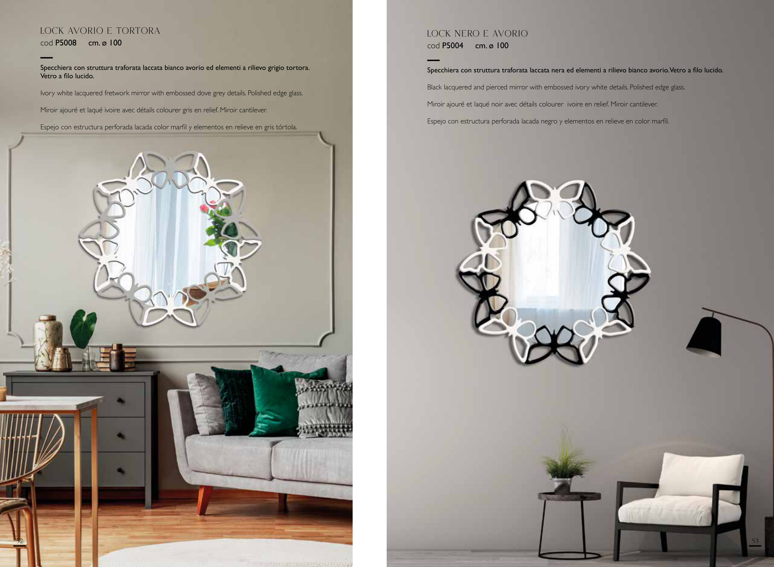 Specchiera con struttura traforata laccata nera ed elementi a rilievo bianco avorio. Vetro a filo lucido.