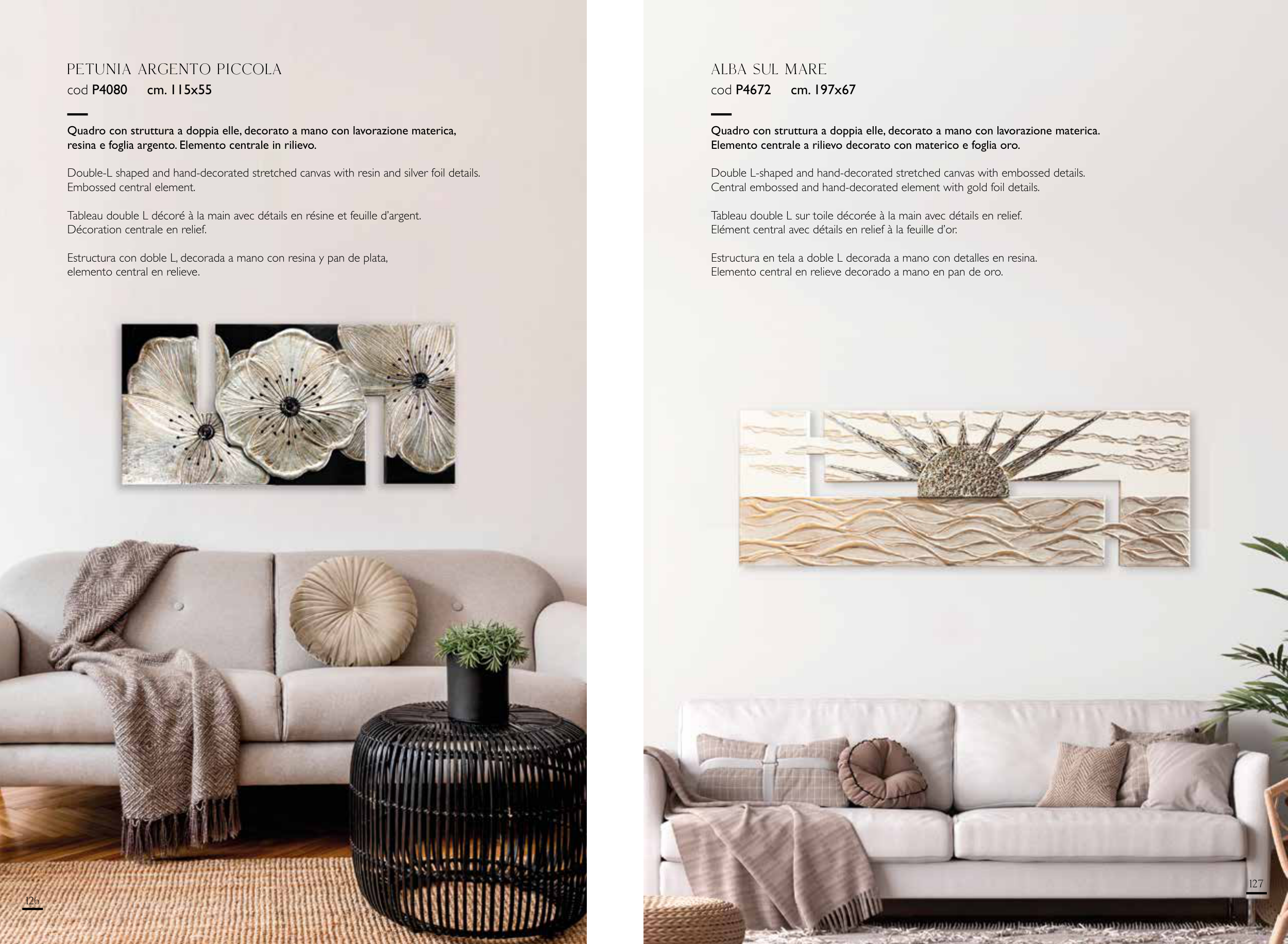 Double L-shaped and hand-decorated stretched canvas with embossed details.