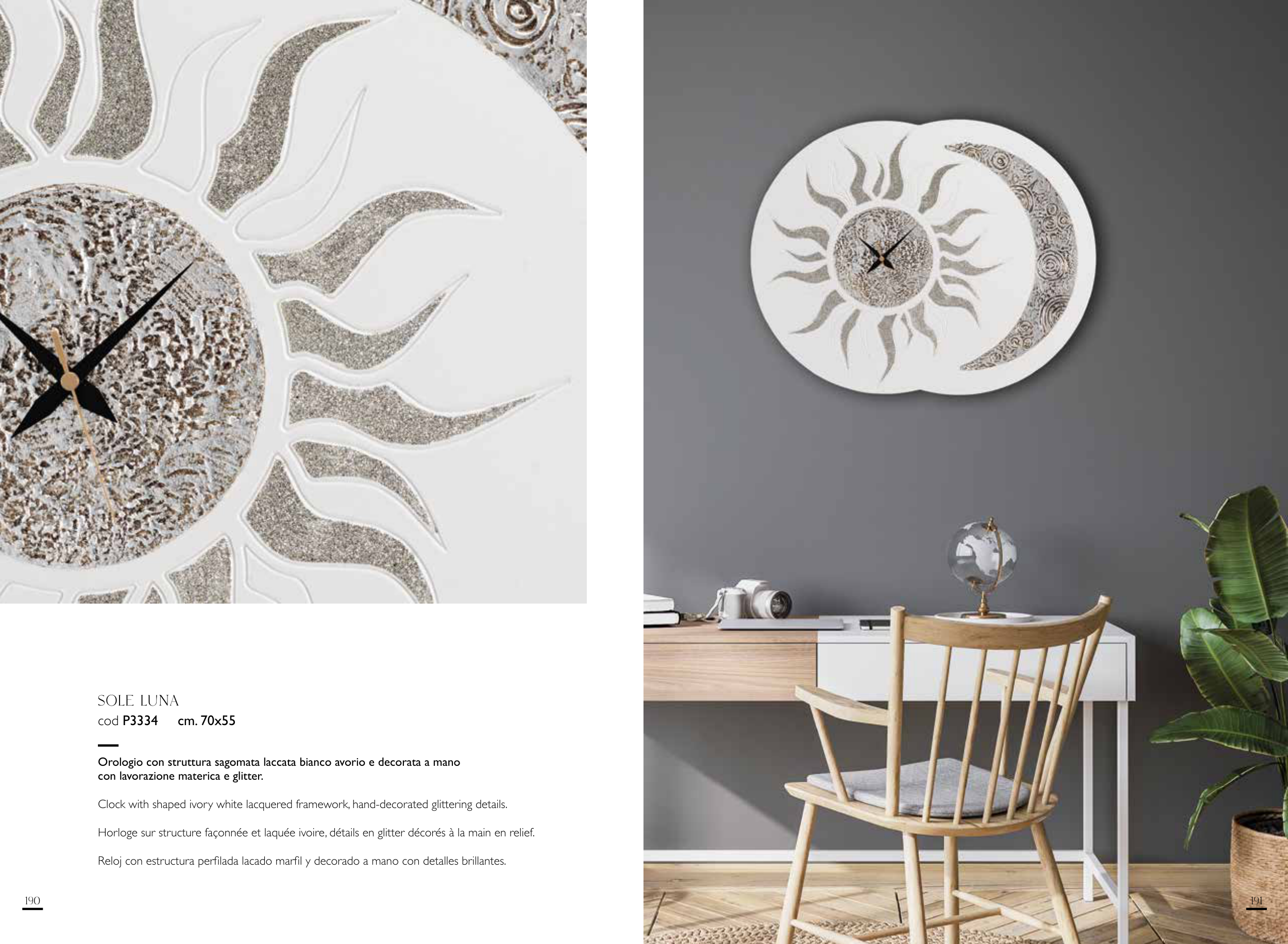Reloj con estructura perfilada lacado marfil y decorado a mano con detalles brillantes.