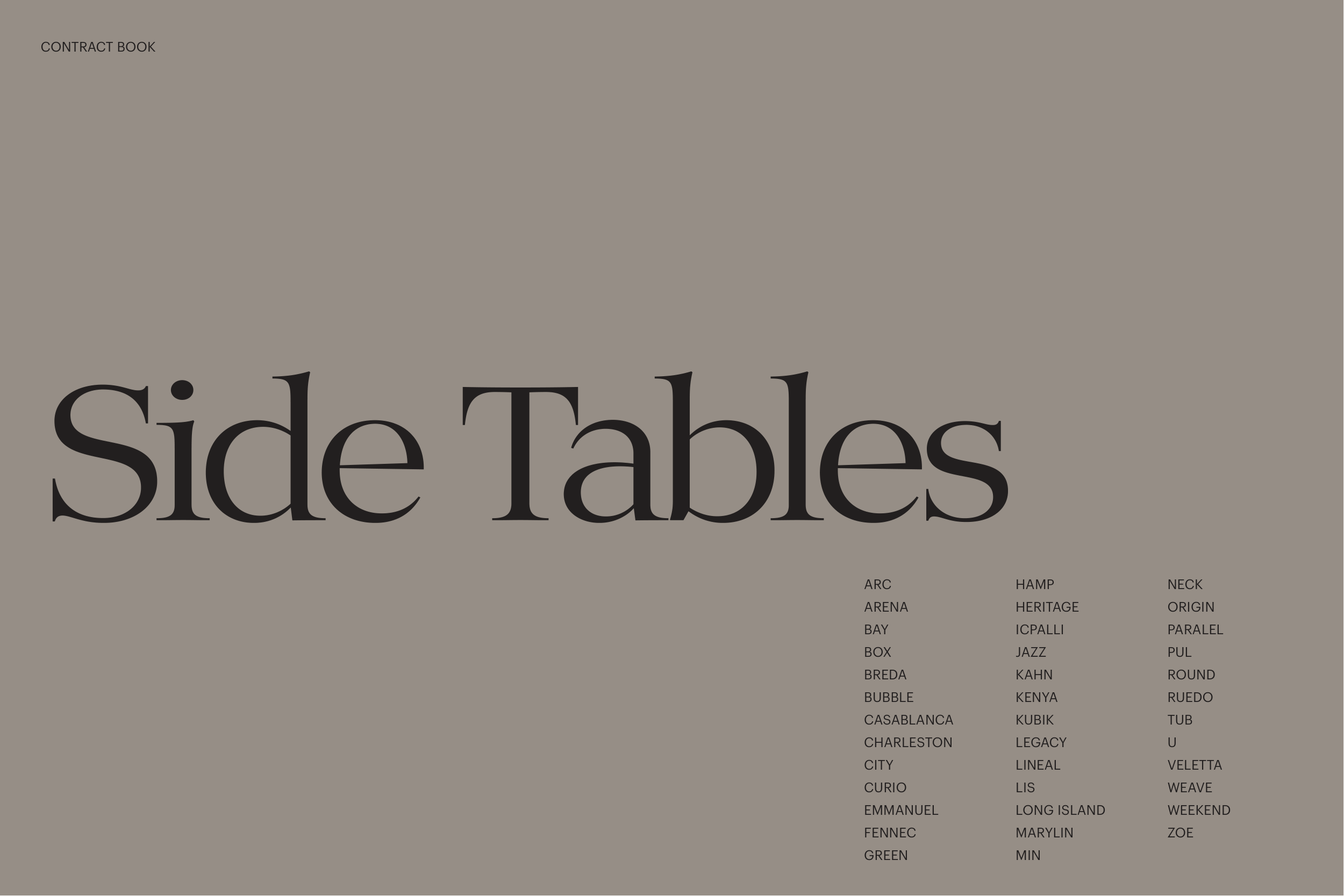CONTRACT BOOK Side Tables HAMP HERITAGE ICPALLI JAZZ KAHN KENYA KUBIK LEGACY LINEAL LIS LONG ISLAND MARYLIN MIN NECK ORIGIN PARALEL PUL ROUND RUEDO TUB U VELETTA WEAVE WEEKEND ZOE ARC ARENA BAY BOX BREDA BUBBLE CASABLANCA CHARLESTON CITY CURIO EMMANUEL FENNEC GREEN