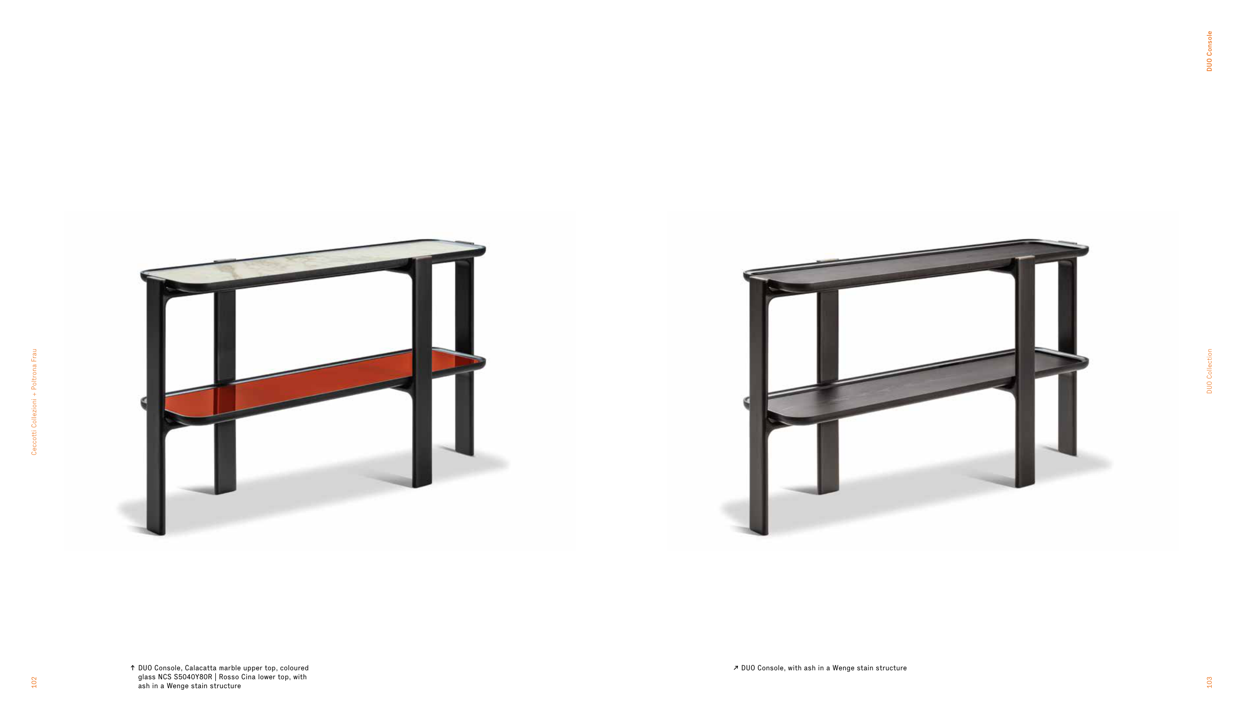 DUO Console 103 DUO Collection 102 Ceccotti Collezioni + Poltrona Frau ↑ DUO Console, Calacatta marble upper top, coloured glass NCS S5040Y80R | Rosso Cina lower top, with ash in a Wenge stain structure ↗ DUO Console, with ash in a Wenge stain structure