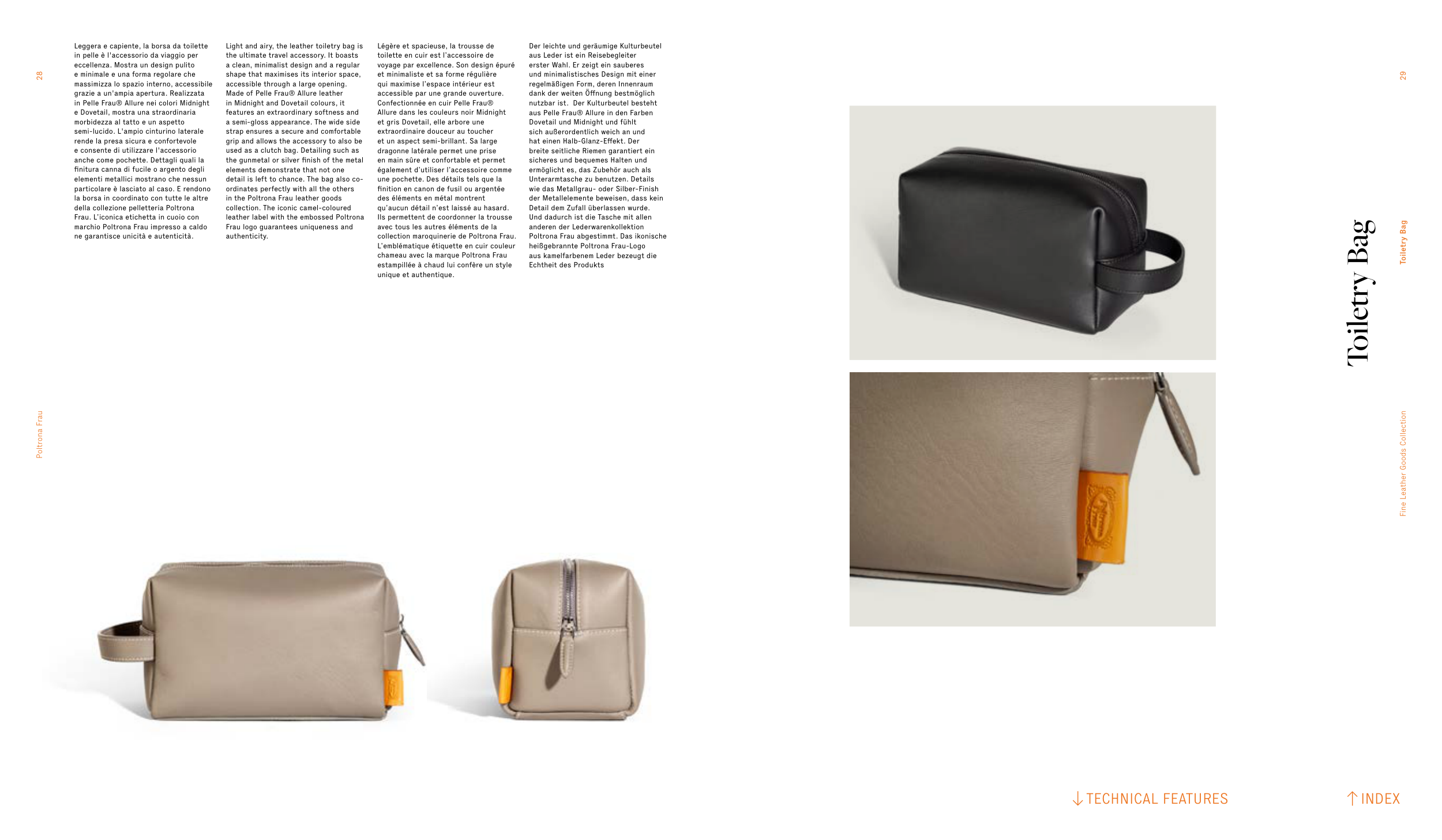 Light and airy, the leather toiletry bag is