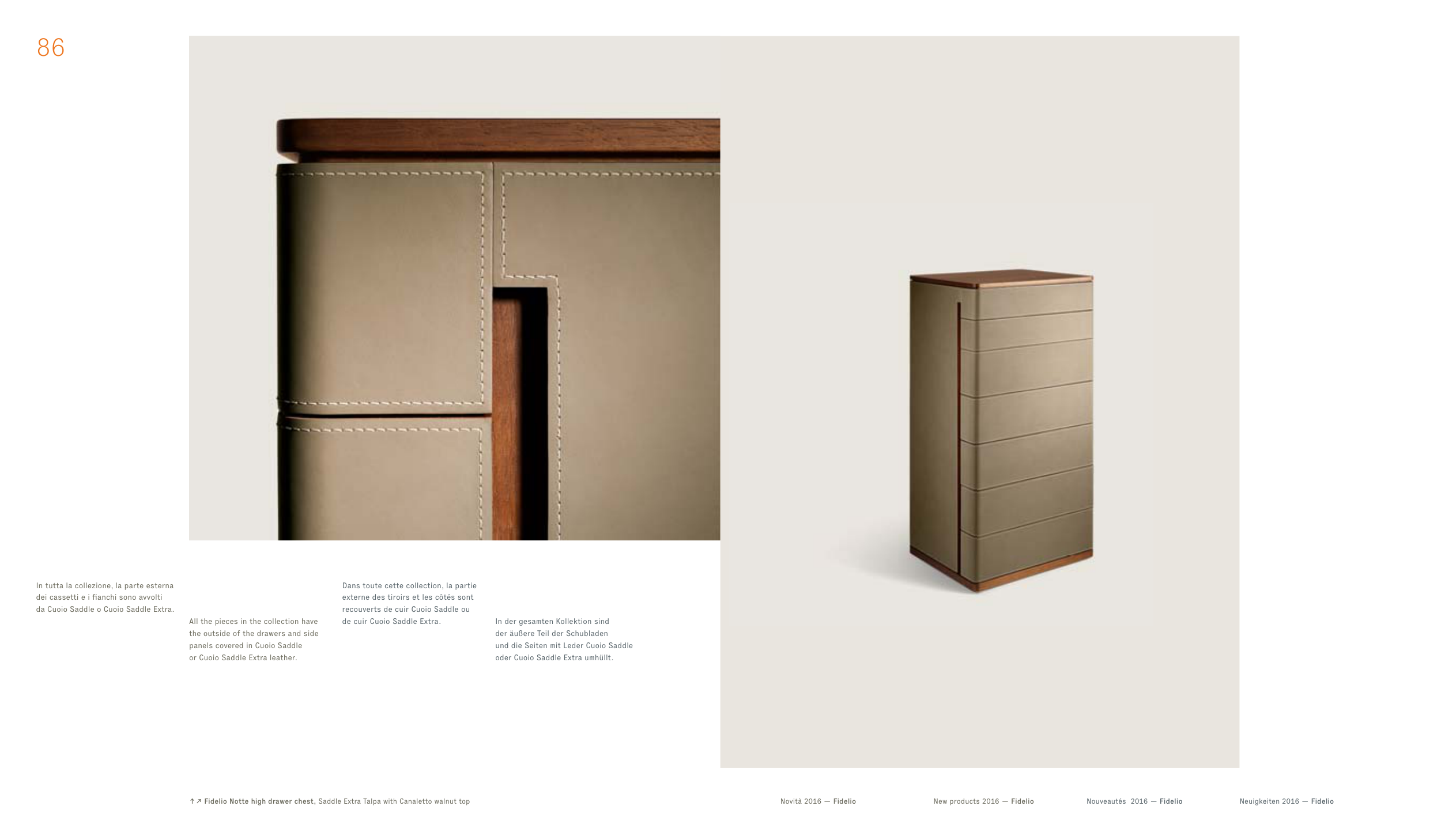 ↑↗ Fidelio Notte high drawer chest, Saddle Extra Talpa with Canaletto walnut top