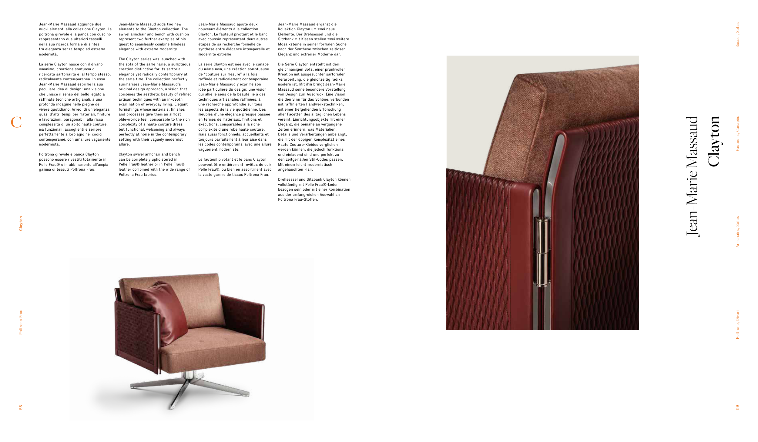 Clayton. Le fauteuil pivotant et le banc