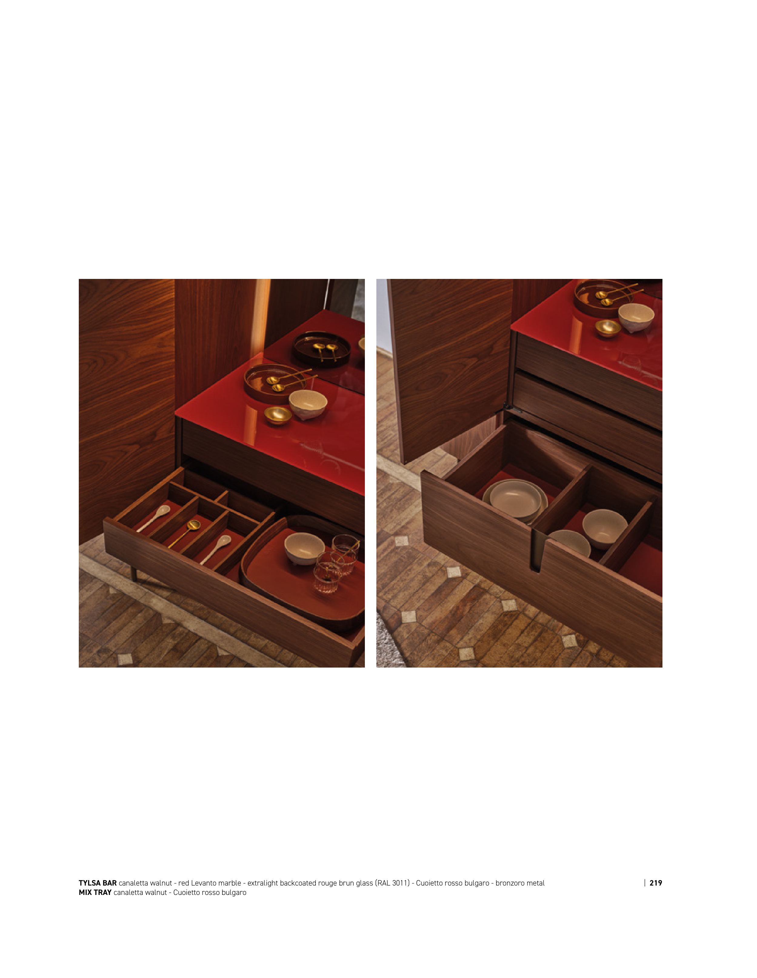 TYLSA BAR canaletta walnut - red Levanto marble - extralight backcoated rouge brun glass (RAL 3011) - Cuoietto rosso bulgaro - bronzoro metal