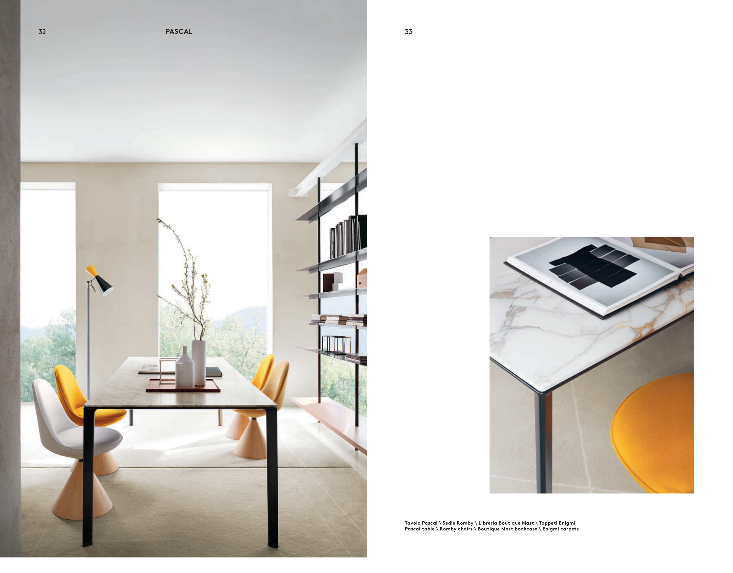 Pascal table \ Romby chairs \ Boutique Mast bookcase \ Enigmi carpets