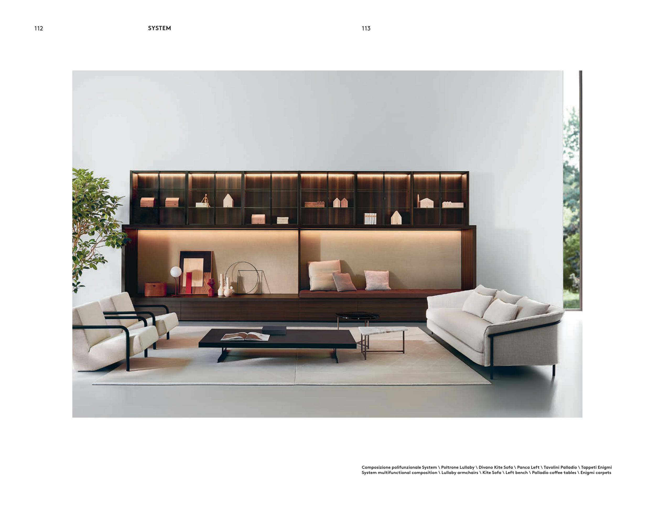 Composizione polifunzionale System \ Poltrone Lullaby \ Divano Kite Sofa \ Panca Left \ Tavolini Palladio \ Tappeti Enigmi