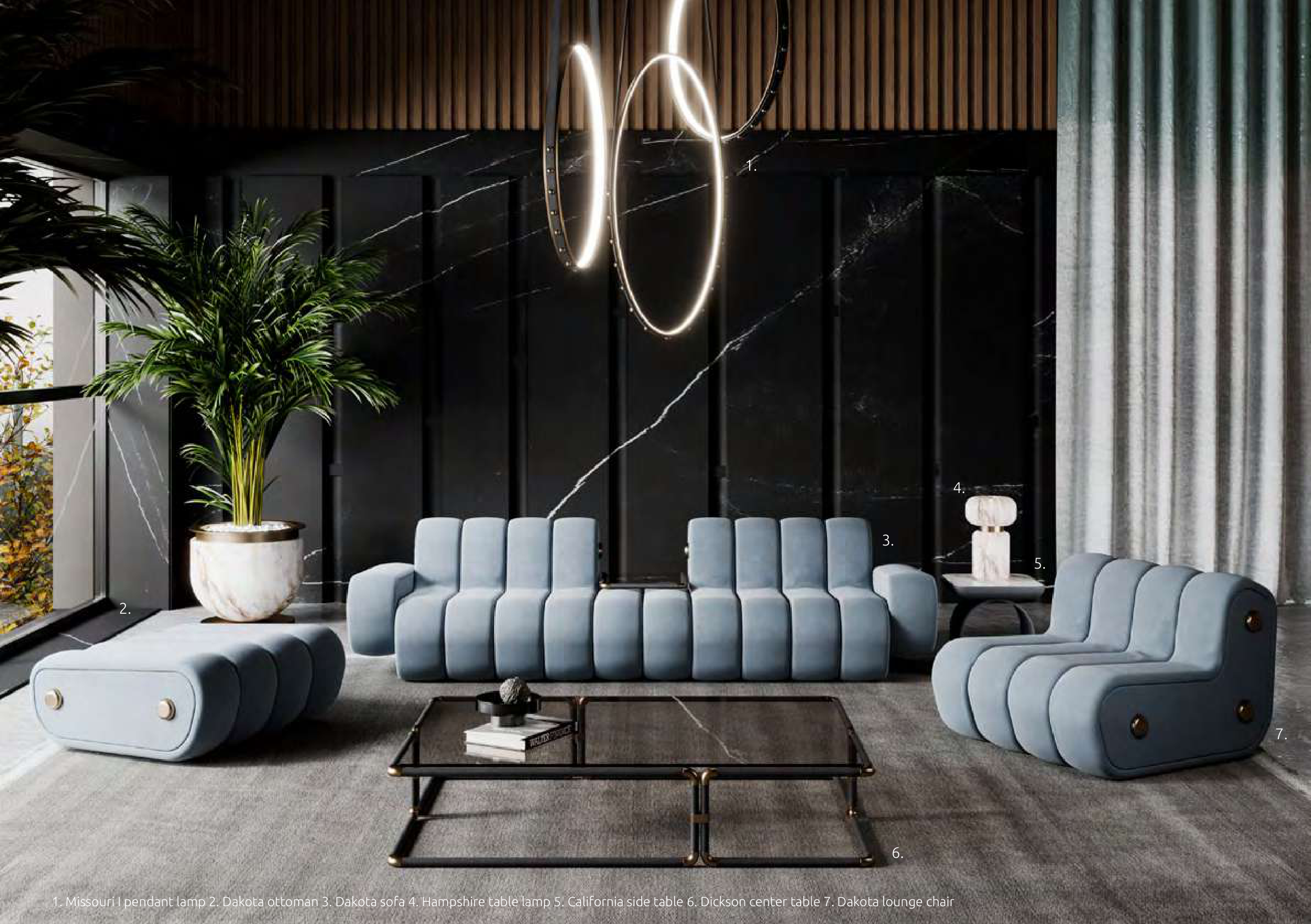 1. Missouri I pendant lamp 2. Dakota ottoman 3. Dakota sofa 4. Hampshire table lamp 5. California side table 6. Dickson center table 7. Dakota lounge chair