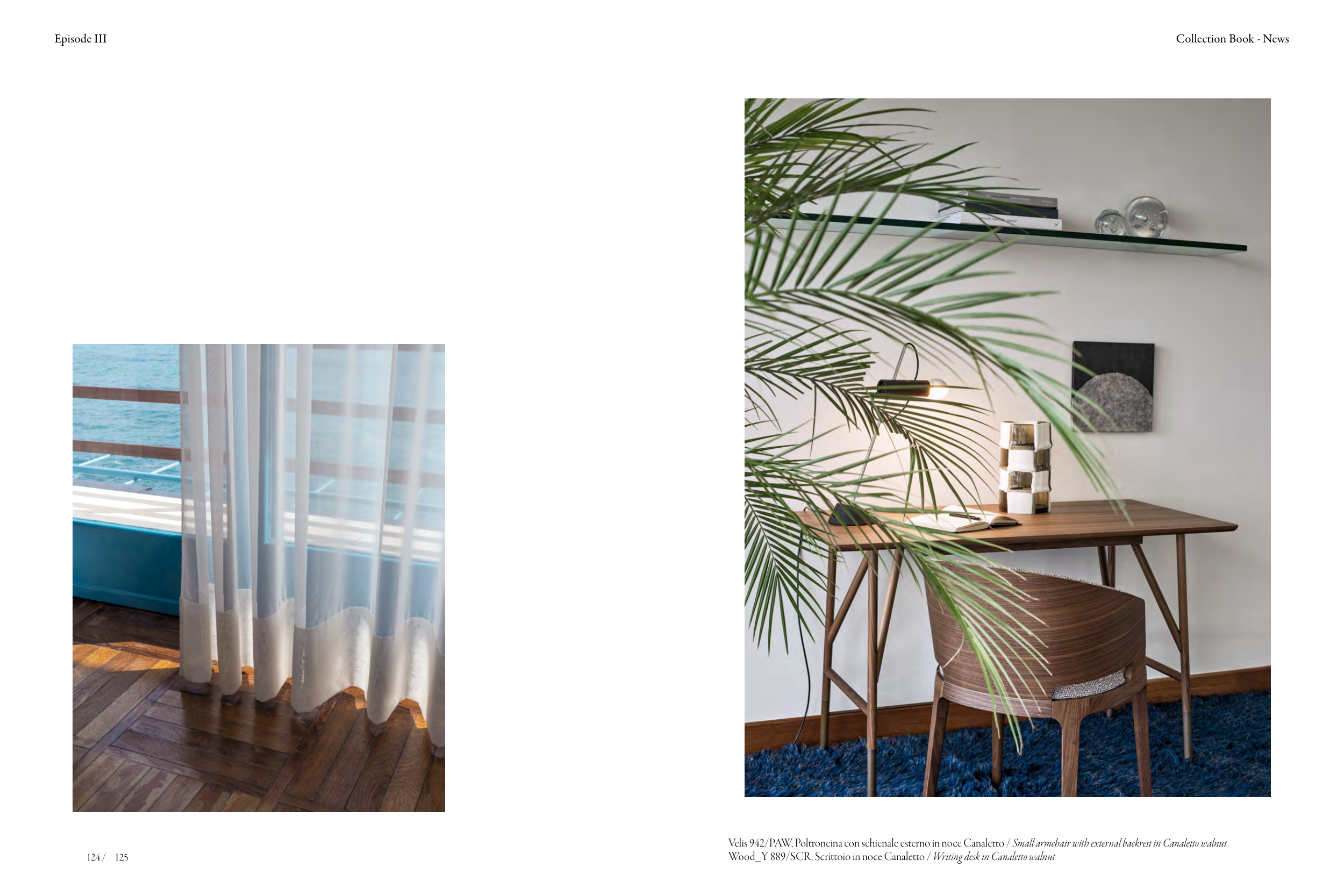 Episode III 124 / 125 Velis 942/PAW, Poltroncina con schienale esterno in noce Canaletto / Small armchair with external backrest in Canaletto walnut Wood_Y 889/SCR, Scrittoio in noce Canaletto / Writing desk in Canaletto walnut Collection Book - News