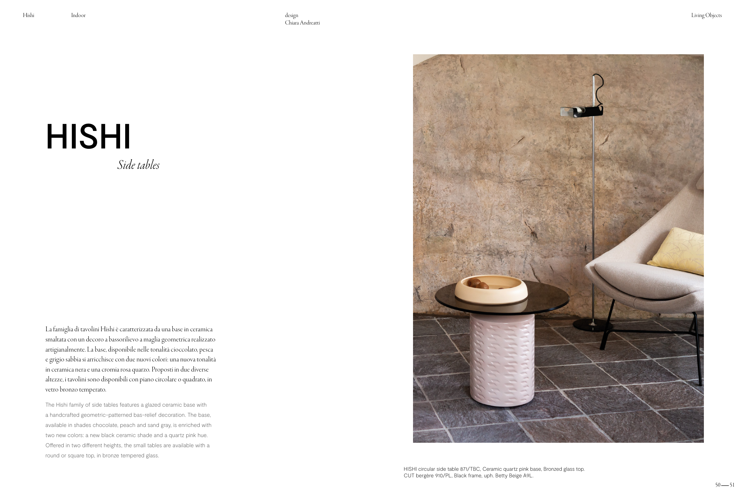 La famiglia di tavolini Hishi è caratterizzata da una base in ceramica