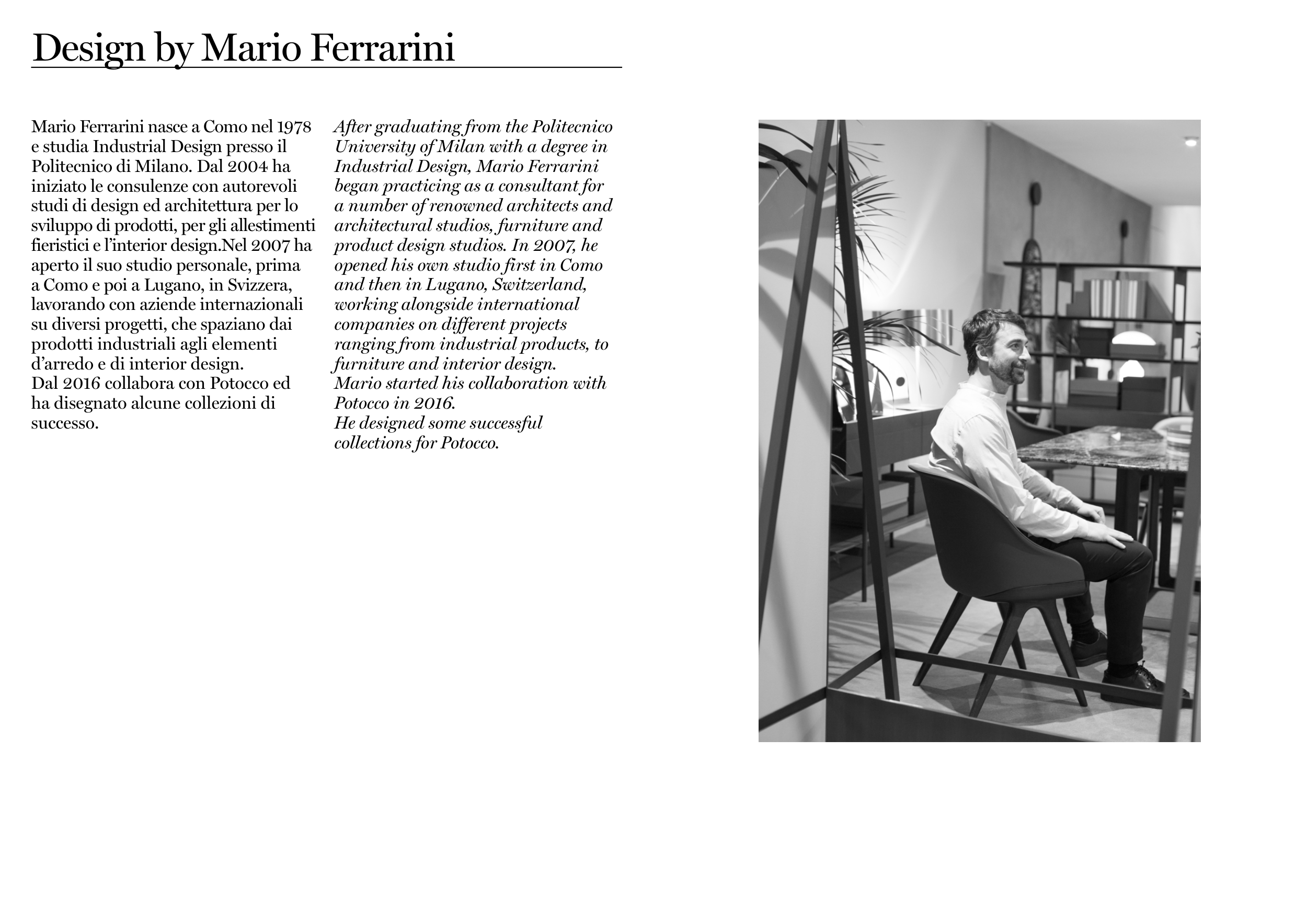 Dal 2016 collabora con Potocco ed