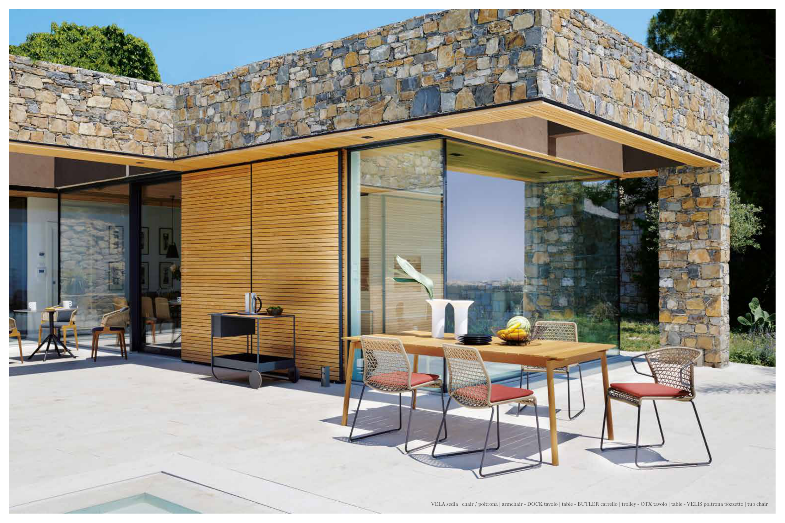 VELA sedia | chair / poltrona | armchair - DOCK tavolo | table - BUTLER carrello | trolley - OTX tavolo | table - VELIS poltrona pozzetto | tub chair