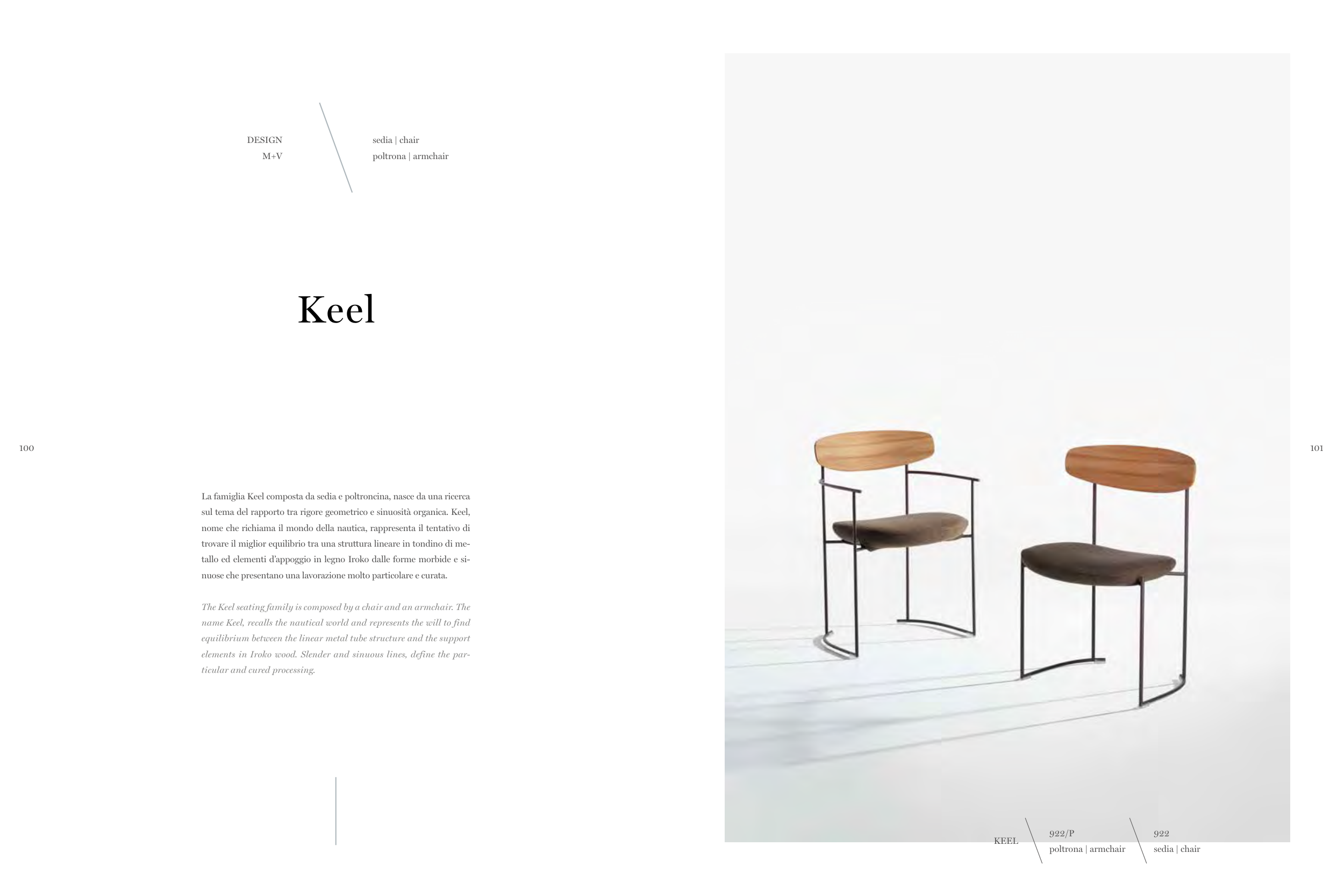 The Keel seating family is composed by a chair and an armchair. The
