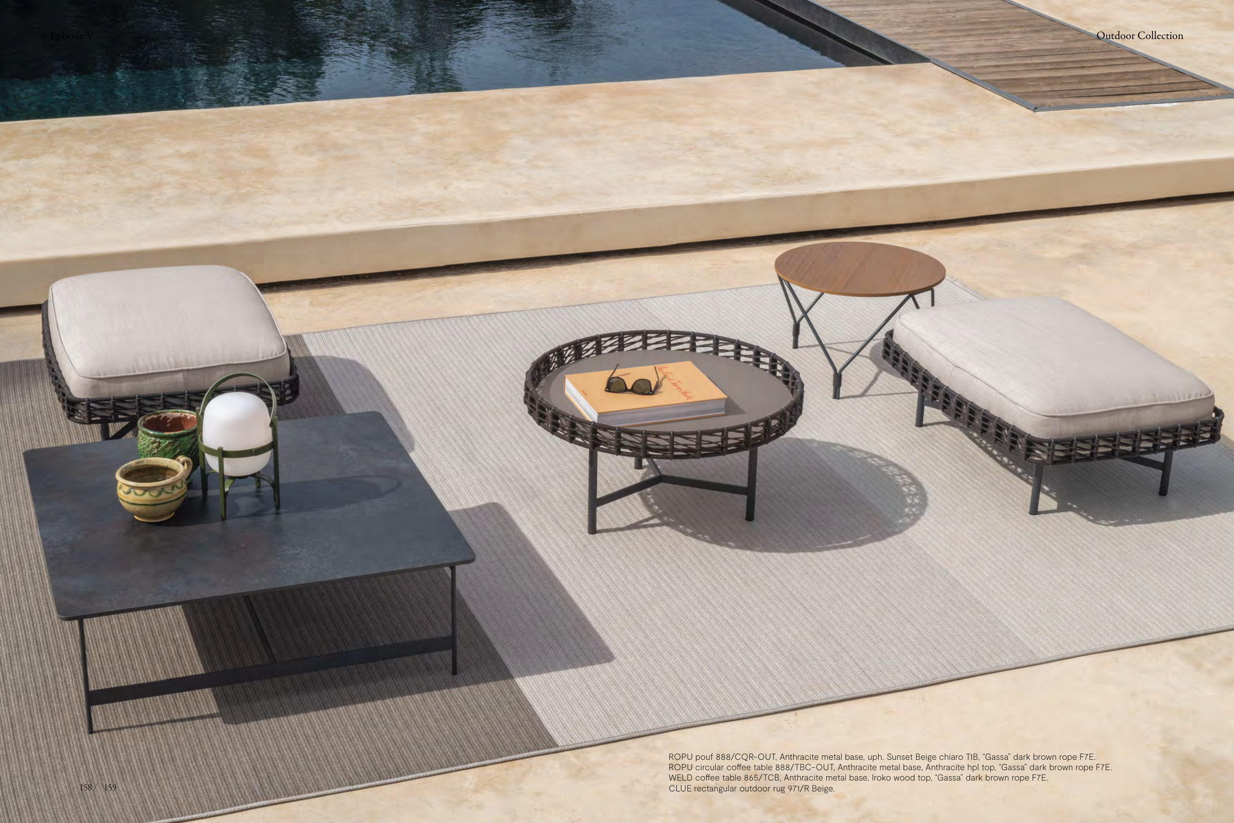 ROPU pouf 888/CQR-OUT, Anthracite metal base, uph. Sunset Beige chiaro T1B, “Gassa” dark brown rope F7E.