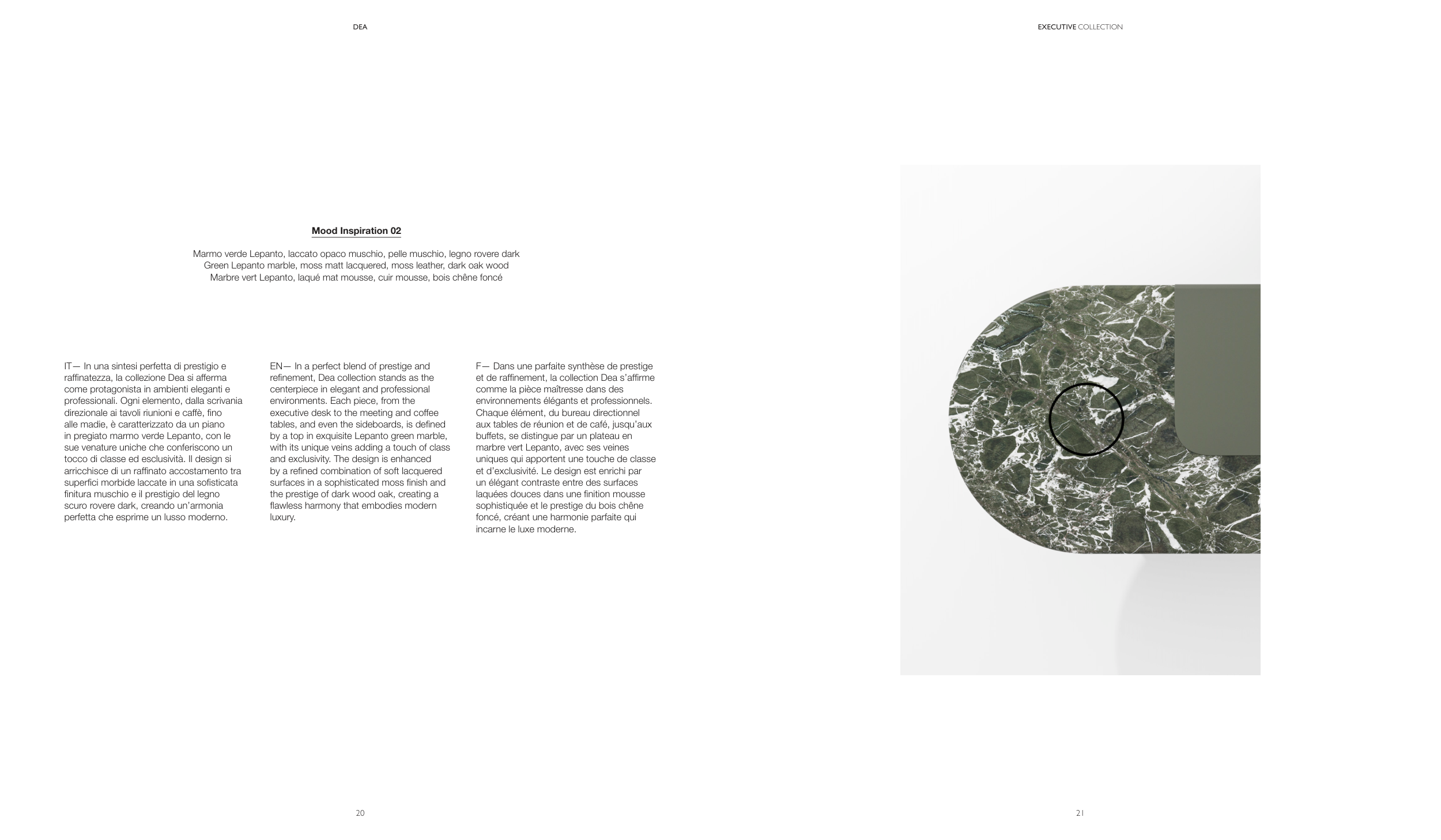 Green Lepanto marble, moss matt lacquered, moss leather, dark oak wood
