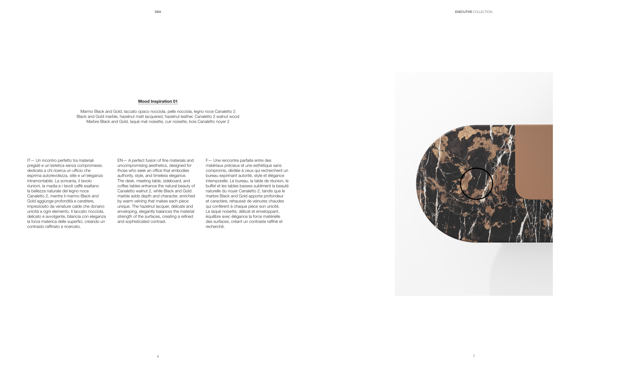 Marbre Black and Gold, laqué mat noisette, cuir noisette, bois Canaletto noyer 2