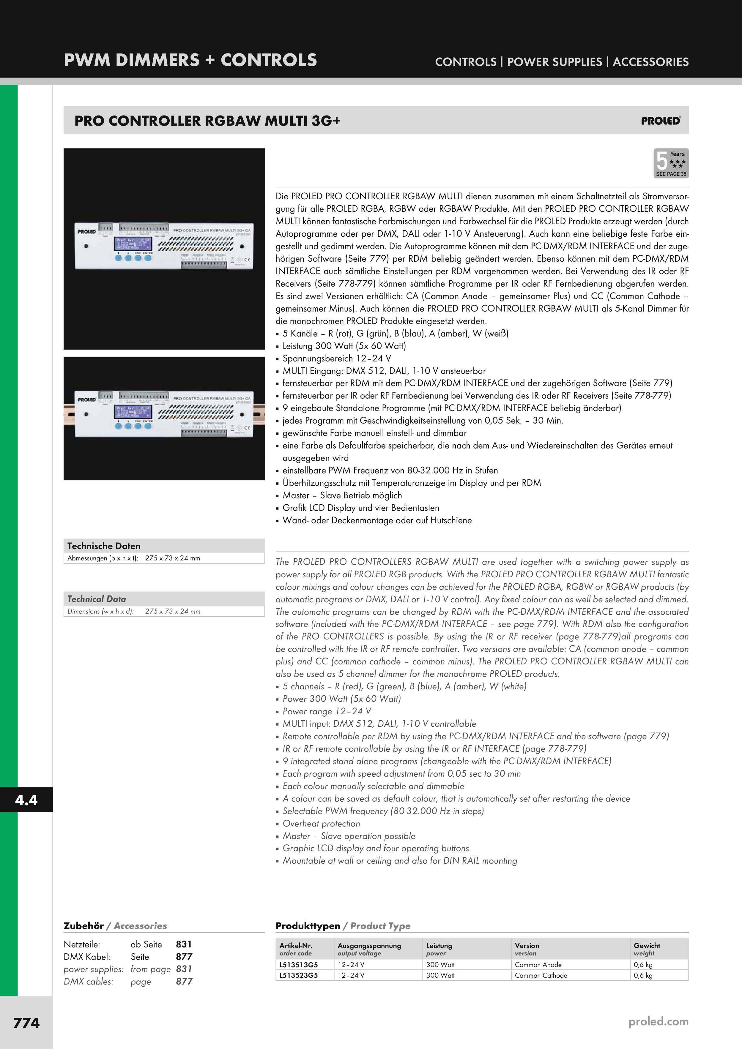 also be used as 5 channel dimmer for the monochrome PROLED products.