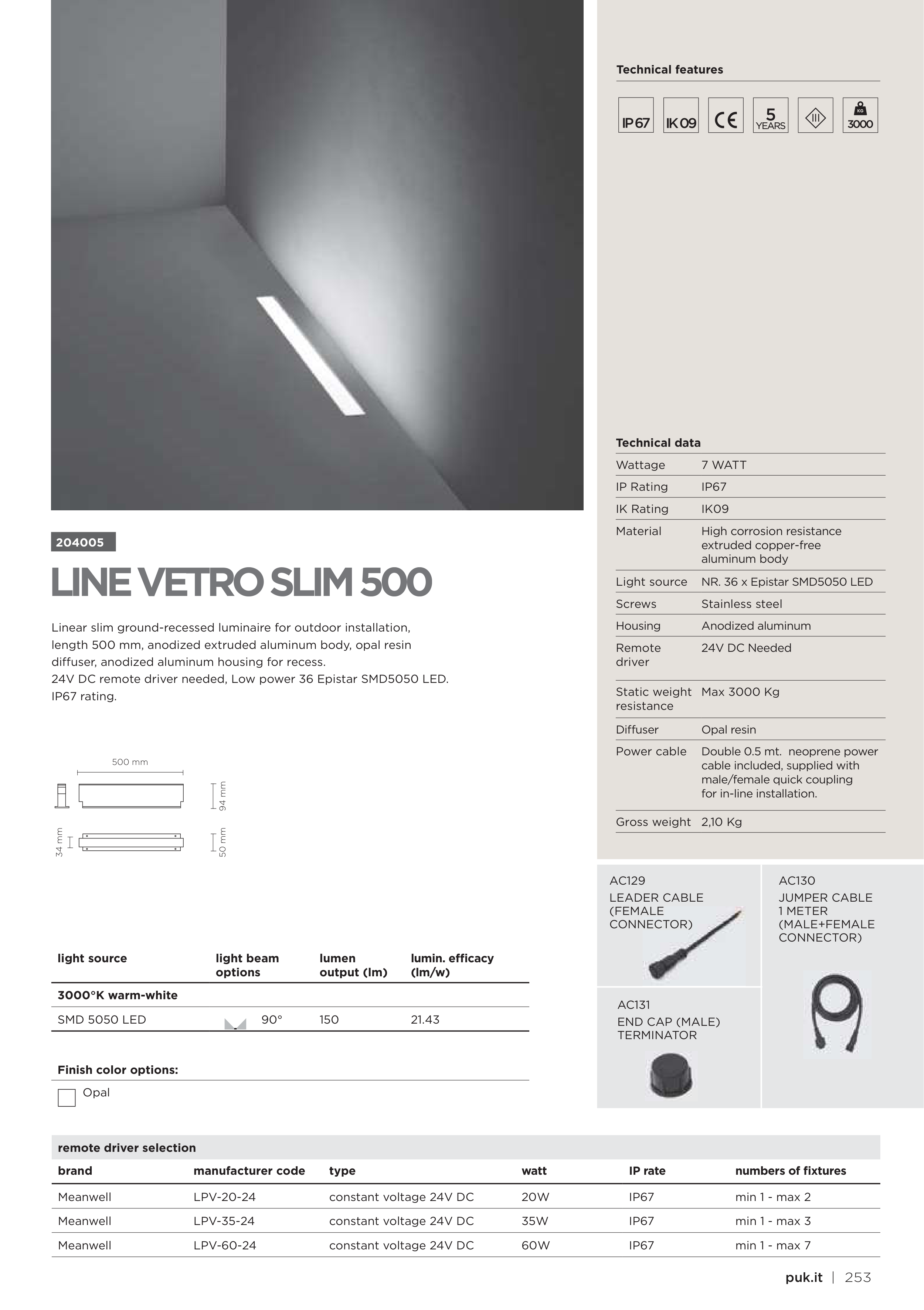 length 500 mm, anodized extruded aluminum body, opal resin