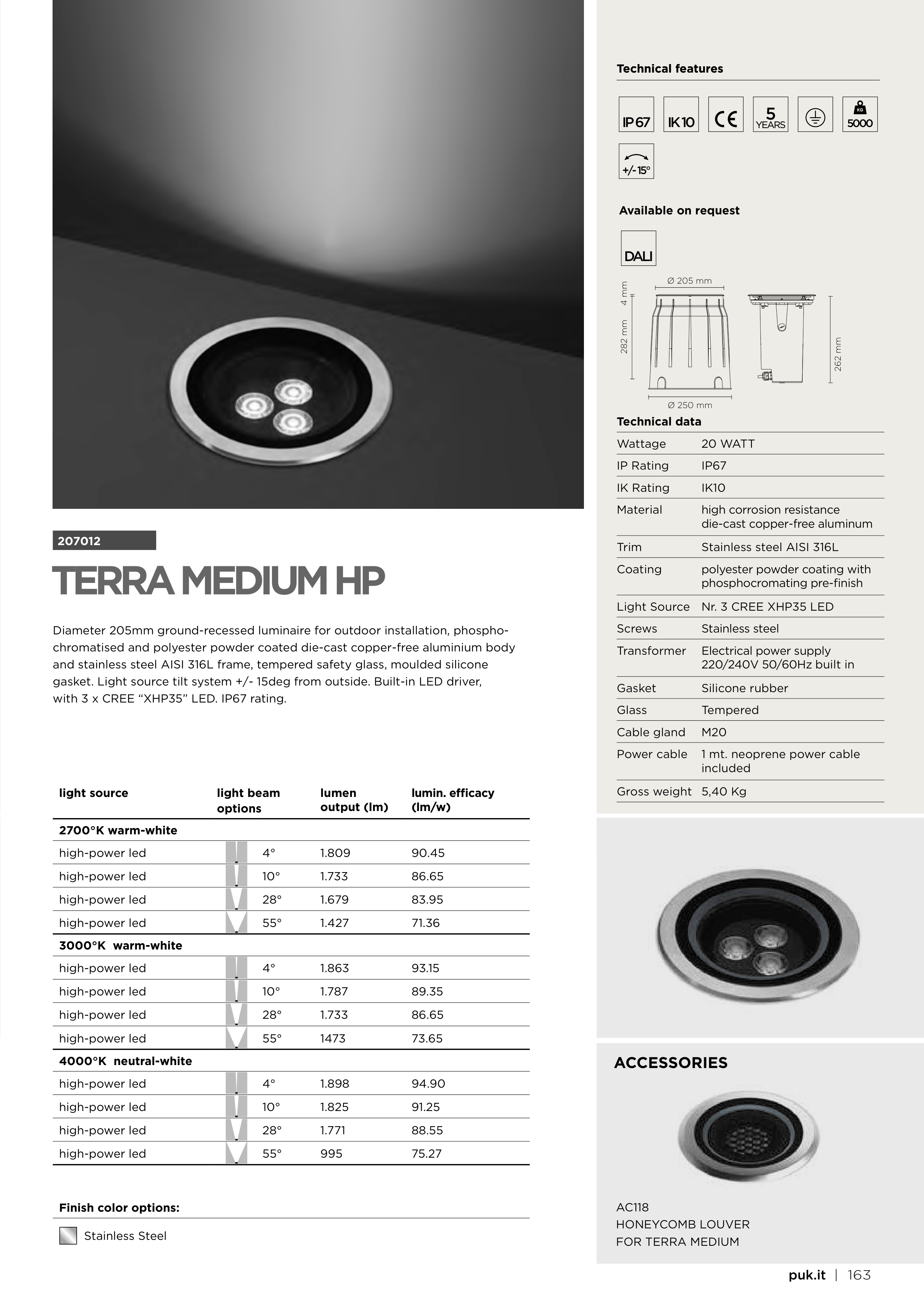 gasket. Light source tilt system +/- 15deg from outside. Built-in LED driver,