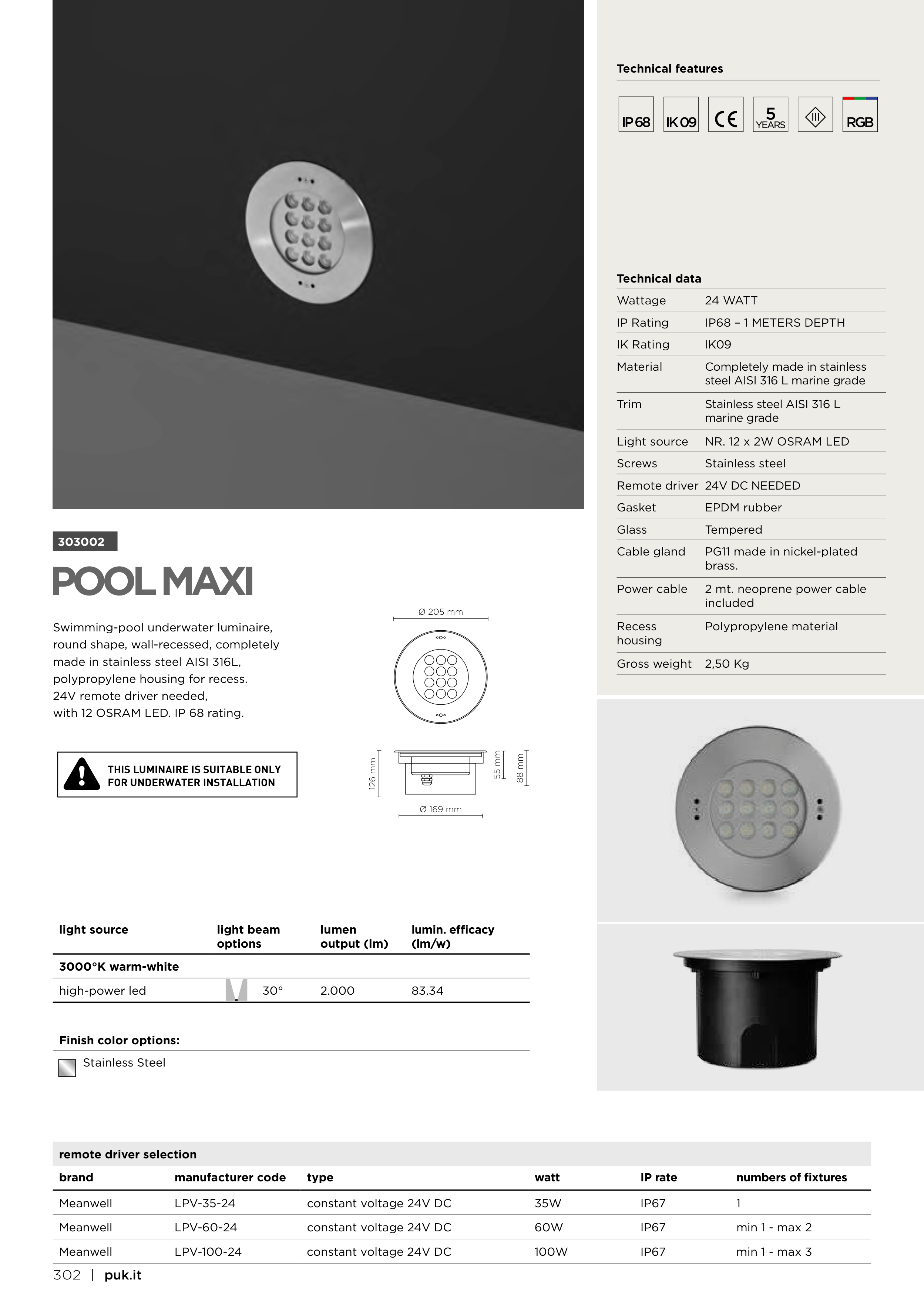 with 12 OSRAM LED. IP 68 rating.
