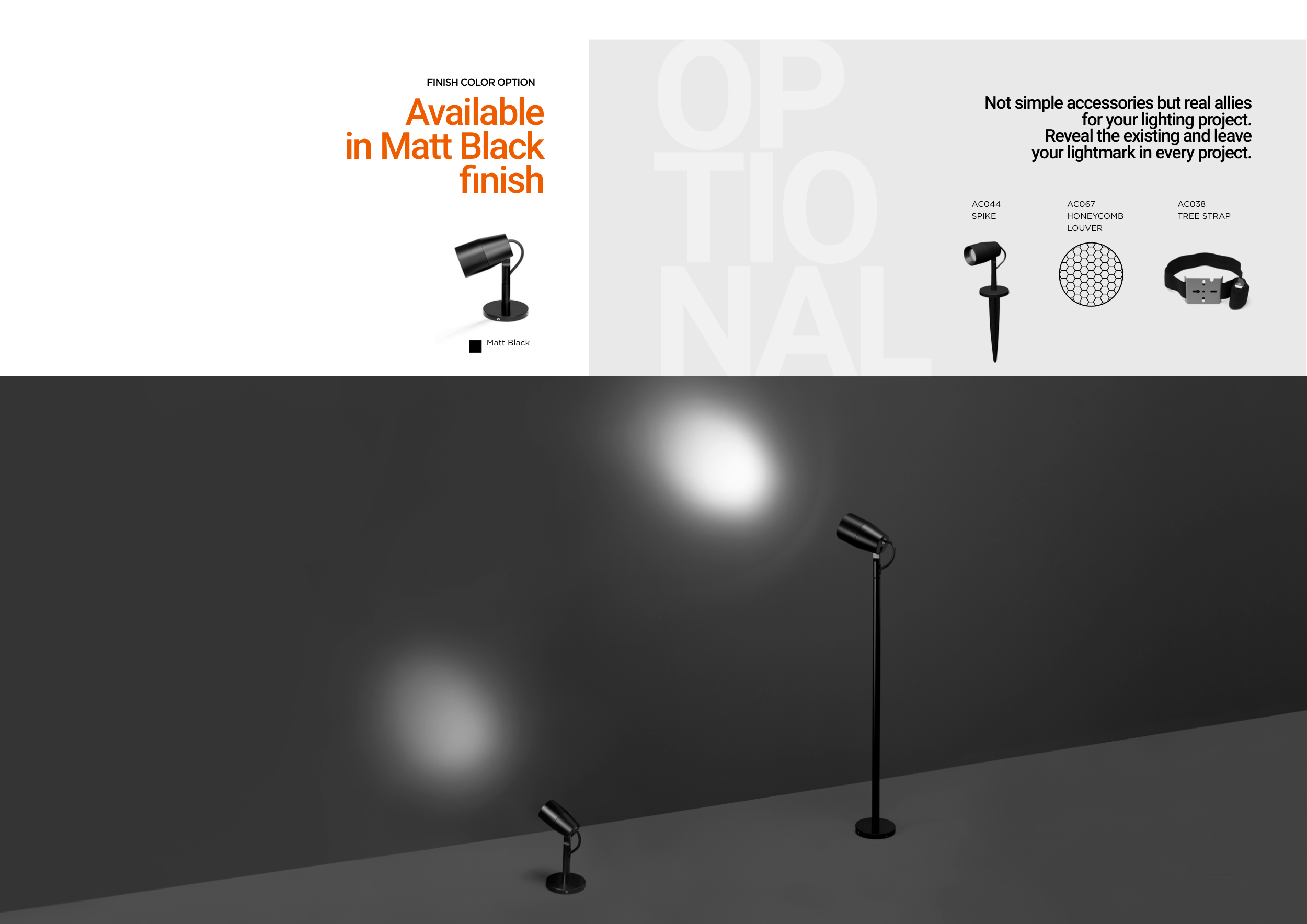Matt Black AC044 SPIKE AC067 HONEYCOMB LOUVER AC038 TREE STRAP OP TIO NAL Not simple accessories but real allies for your lighting project. Reveal the existing and leave your lightmark in every project.