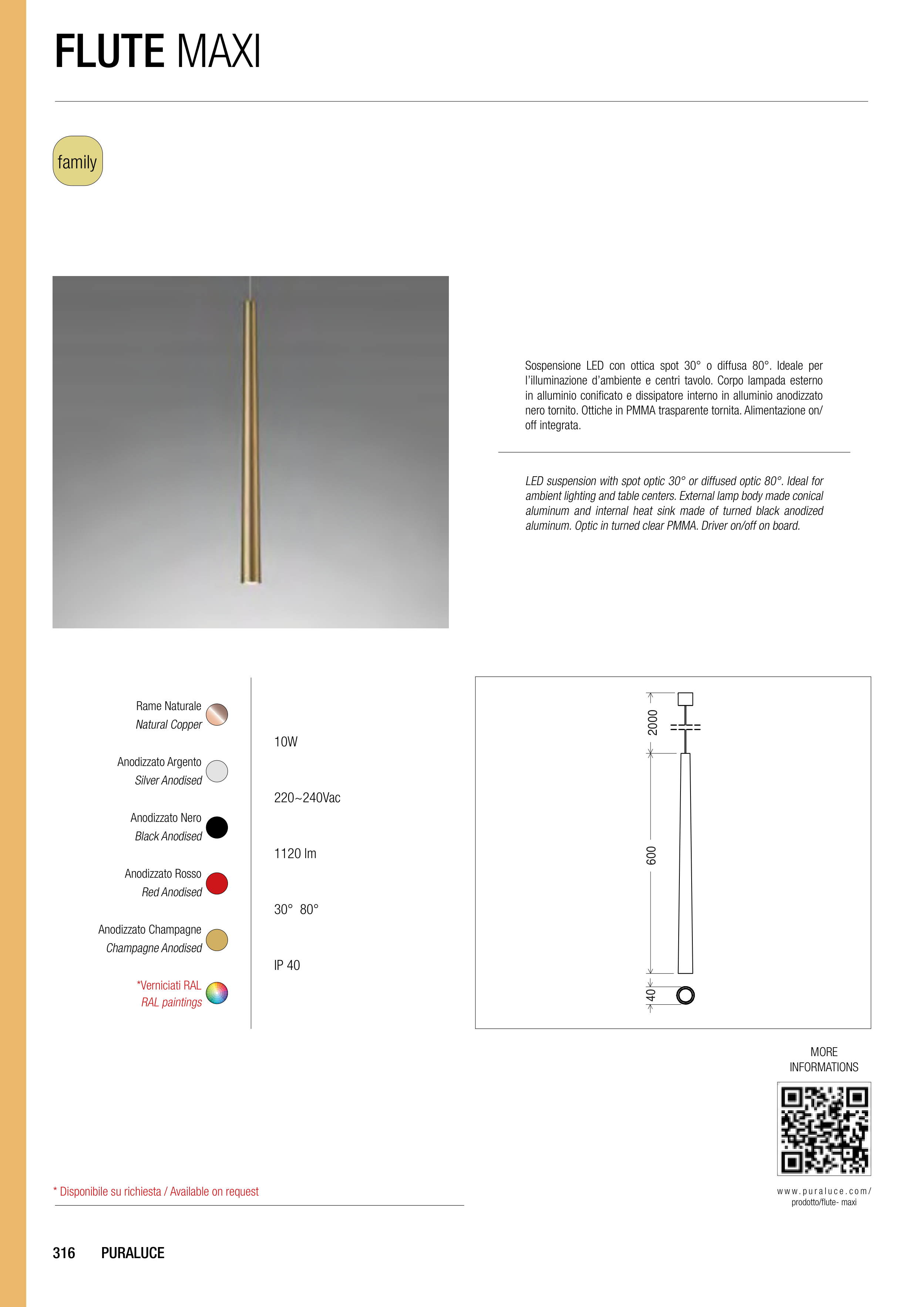 LED suspension with spot optic 30° or diffused optic 80°. Ideal for