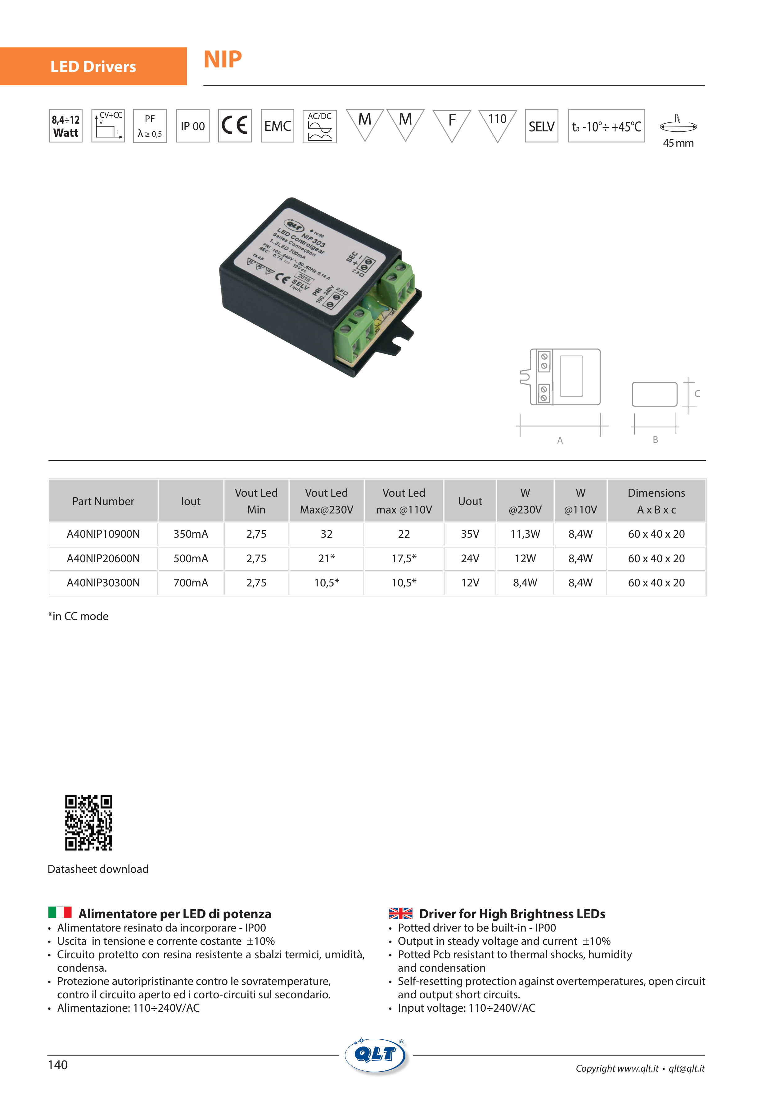 • Circuito protetto con resina resistente a sbalzi termici, umidità,