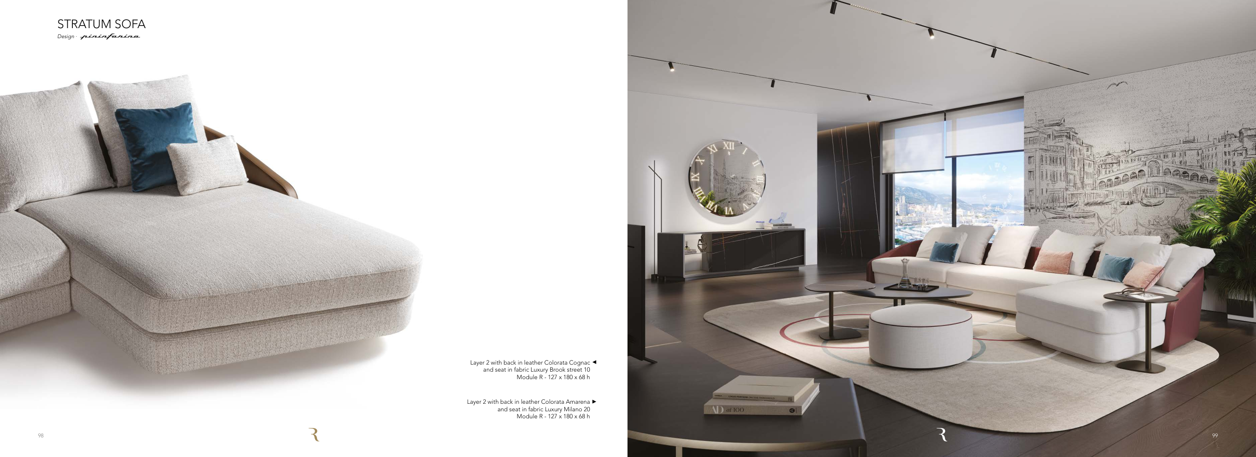 Layer 2 with back in leather Colorata Amarena and seat in fabric Luxury Milano 20 Module R - 127 x 180 x 68 h STRATUM SOFA Design ∙ Layer 2 with back in leather Colorata Cognac and seat in fabric Luxury Brook street 10 Module R - 127 x 180 x 68 h 99 98