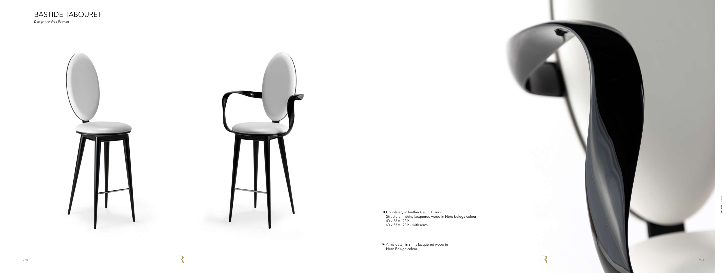 BASTIDE TABOURET Design ∙ Andrée Putman Upholstery in leather Cat. C Bianco Structure in shiny lacquered wood in Nero beluga colour 43 x 53 x 128 h 63 x 53 x 128 h - with arms Arms detail in shiny lacquered wood in Nero Beluga colour 271 270 SEDUTE CHAIRS