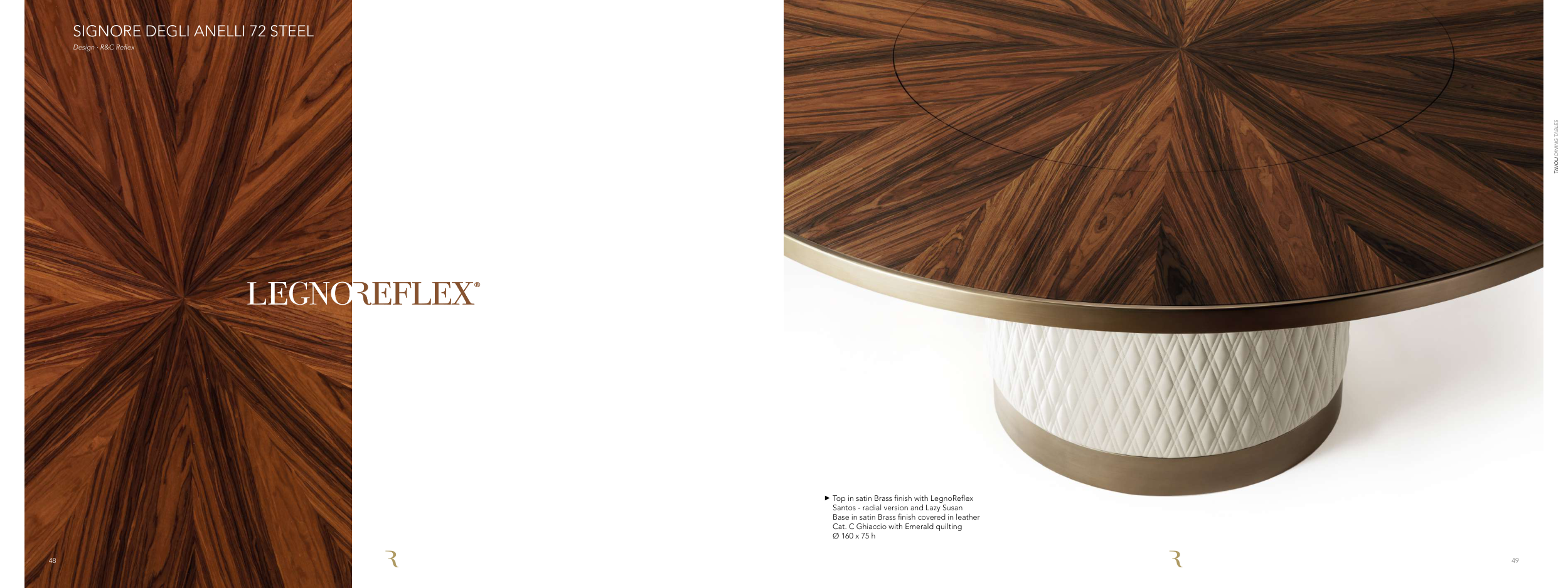SIGNORE DEGLI ANELLI 72 STEEL Design ∙ R&C Reflex Top in satin Brass finish with LegnoReflex Santos - radial version and Lazy Susan Base in satin Brass finish covered in leather Cat. C Ghiaccio with Emerald quilting Ø 160 x 75 h 49 TAVOLI DINING TABLES 48