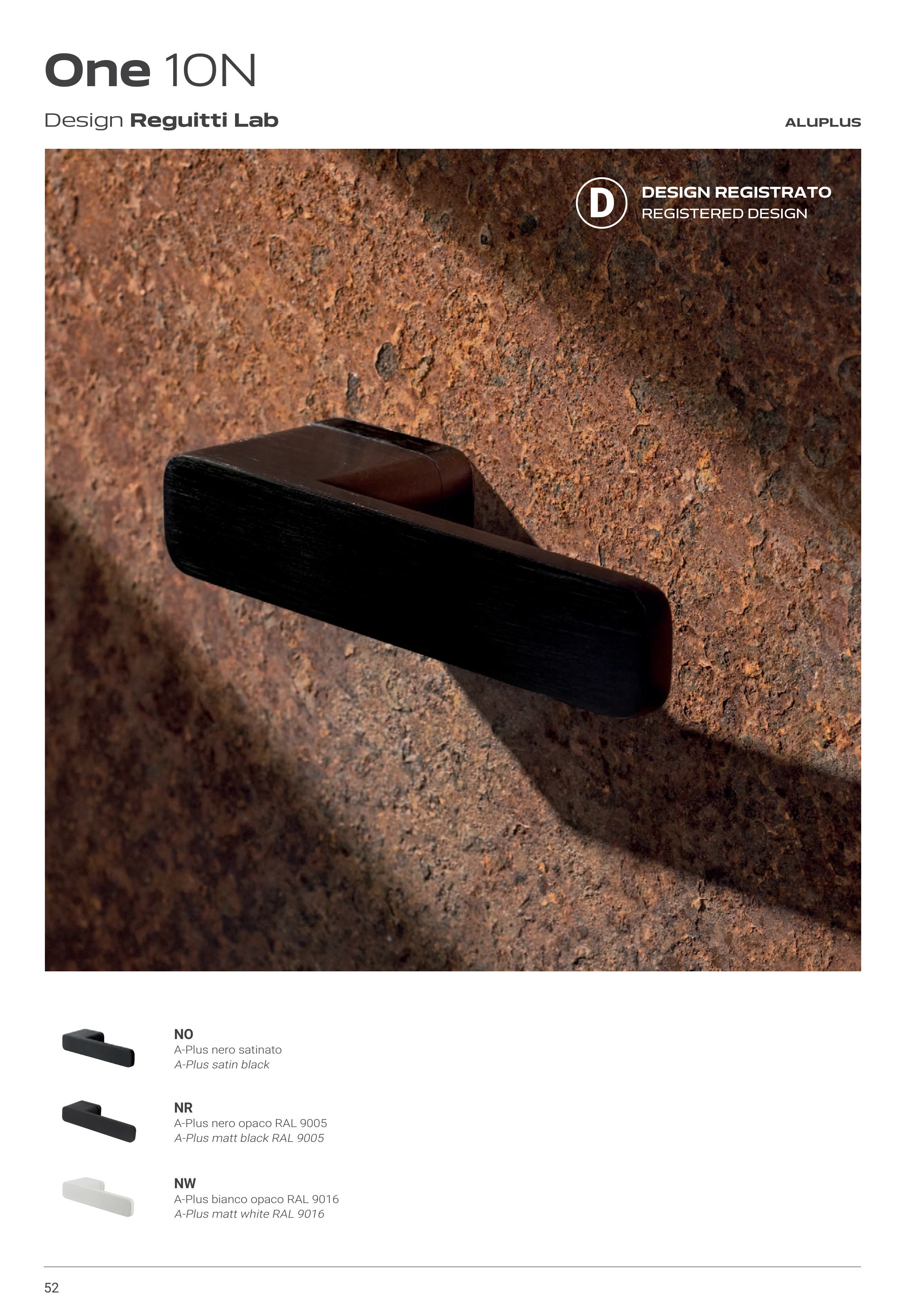 52 NW A-Plus bianco opaco RAL 9016 A-Plus matt white RAL 9016 NO A-Plus nero satinato A-Plus satin black NR A-Plus nero opaco RAL 9005 A-Plus matt black RAL 9005 Design Reguitti Lab Design Reguitti Lab One 10N ALUPLUS DESIGN REGISTRATO REGISTERED DESIGN D