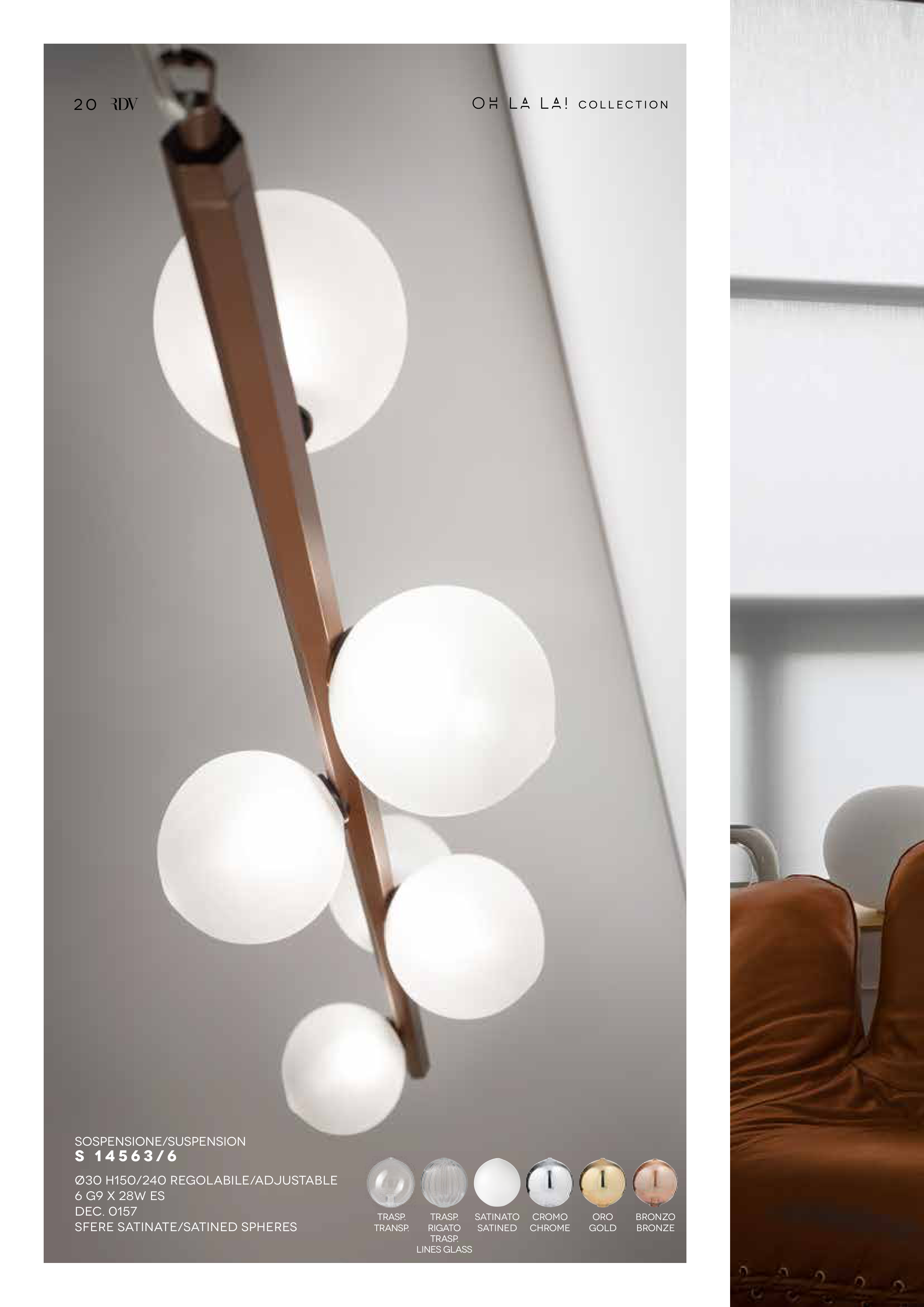 SOSPENSIONE/suspension S 1 4 5 6 3 / 6 Ø30 H150/240 regolabile/Adjustable 6 g9 x 28W ES DEC. 0157 SFERE SATINATE/SATINED SPHEREs TRASP. TRANSP. TRASP. RIGATO TRASP. LINES GLASS SATINATO SATINED CROMO CHROME ORO GOLD BRONZO BRONZE 2 0 O H L A L A ! C O L L E C T I O N