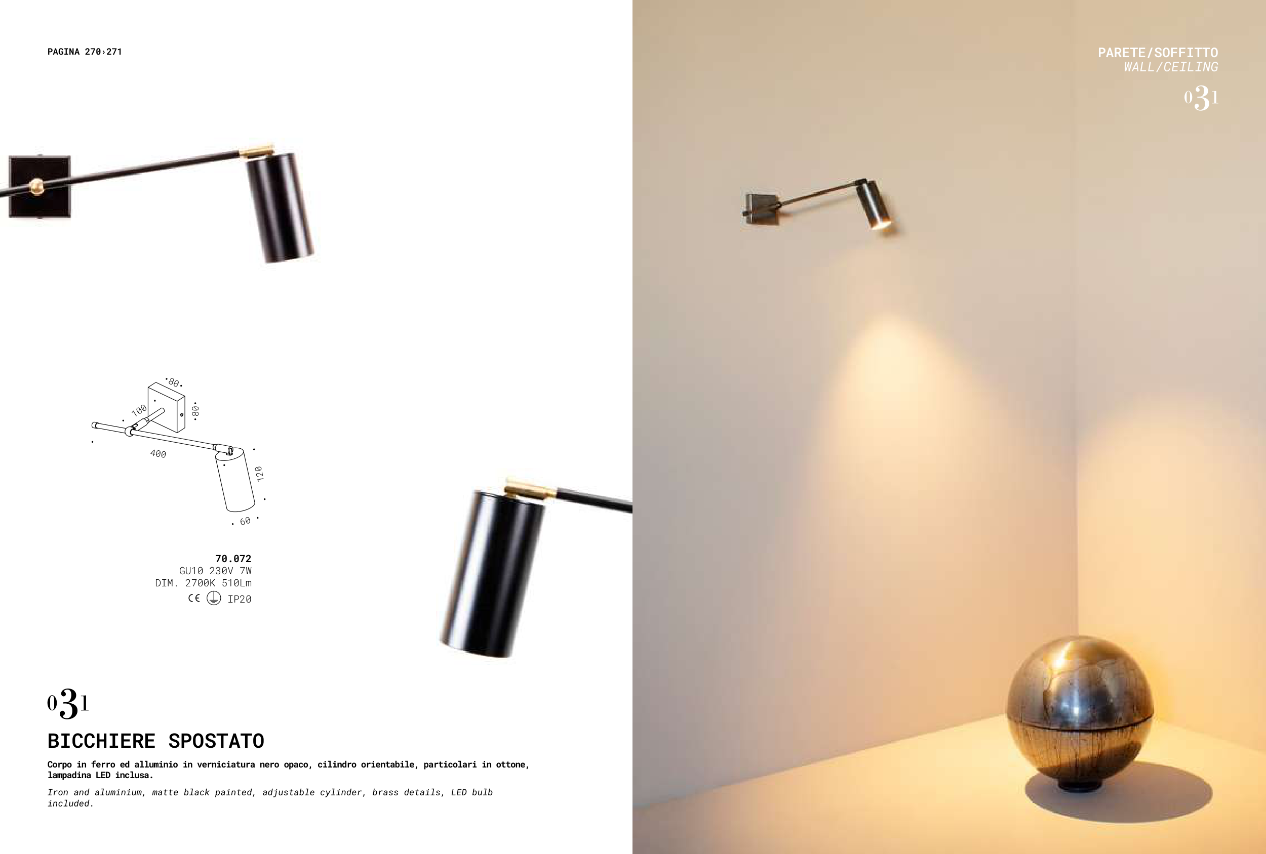 Corpo in ferro ed alluminio in verniciatura nero opaco, cilindro orientabile, particolari in ottone,
