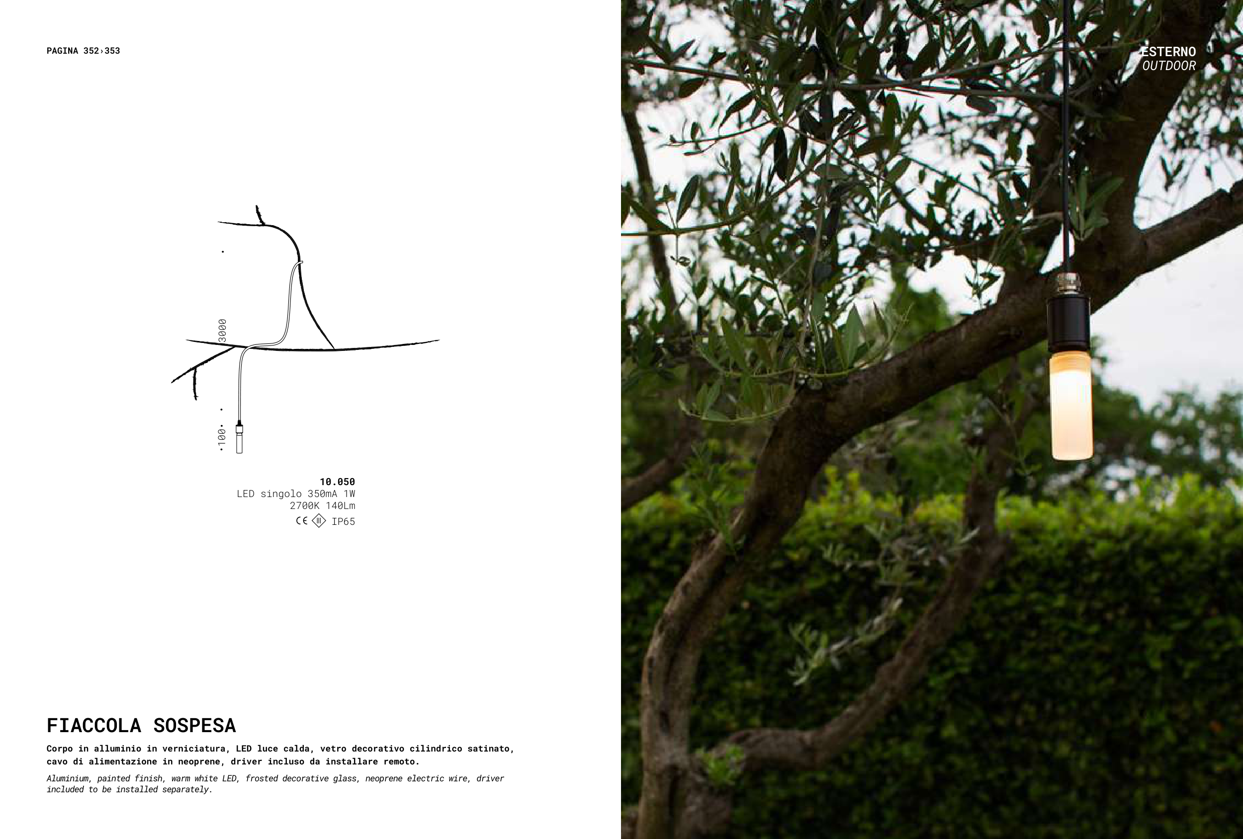 Aluminium, painted finish, warm white LED, frosted decorative glass, neoprene electric wire, driver