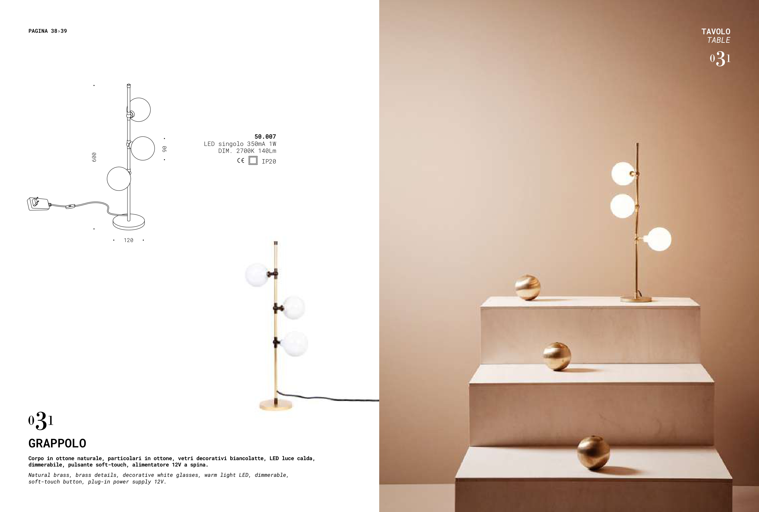 Corpo in ottone naturale, particolari in ottone, vetri decorativi biancolatte, LED luce calda,