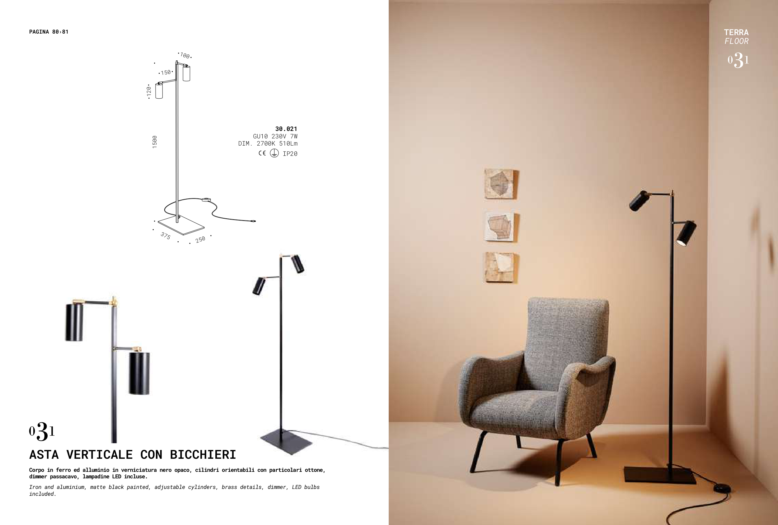 Iron and aluminium, matte black painted, adjustable cylinders, brass details, dimmer, LED bulbs