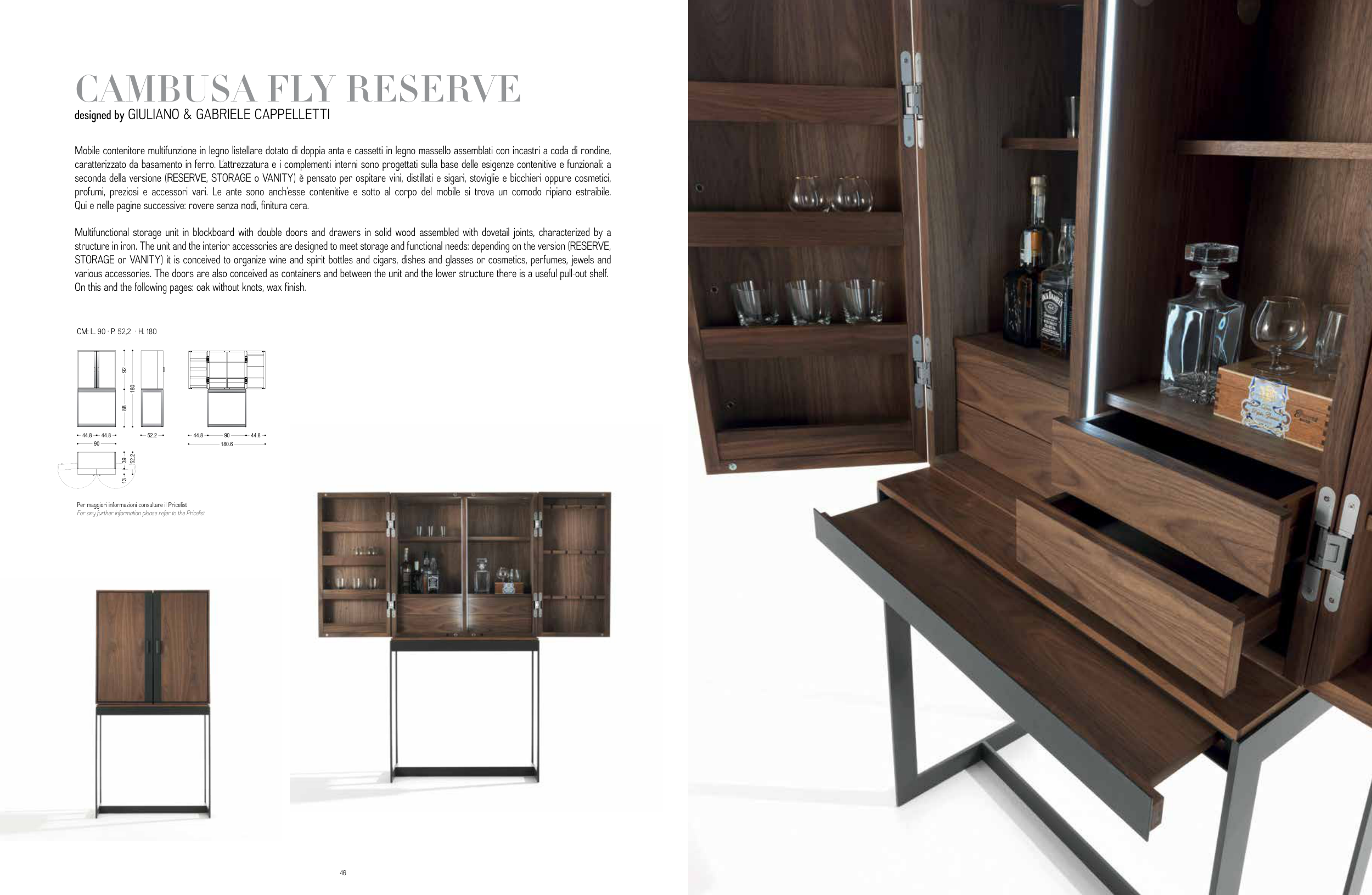 seconda della versione (RESERVE, STORAGE o VANITY) è pensato per ospitare vini, distillati e sigari, stoviglie e bicchieri oppure cosmetici,