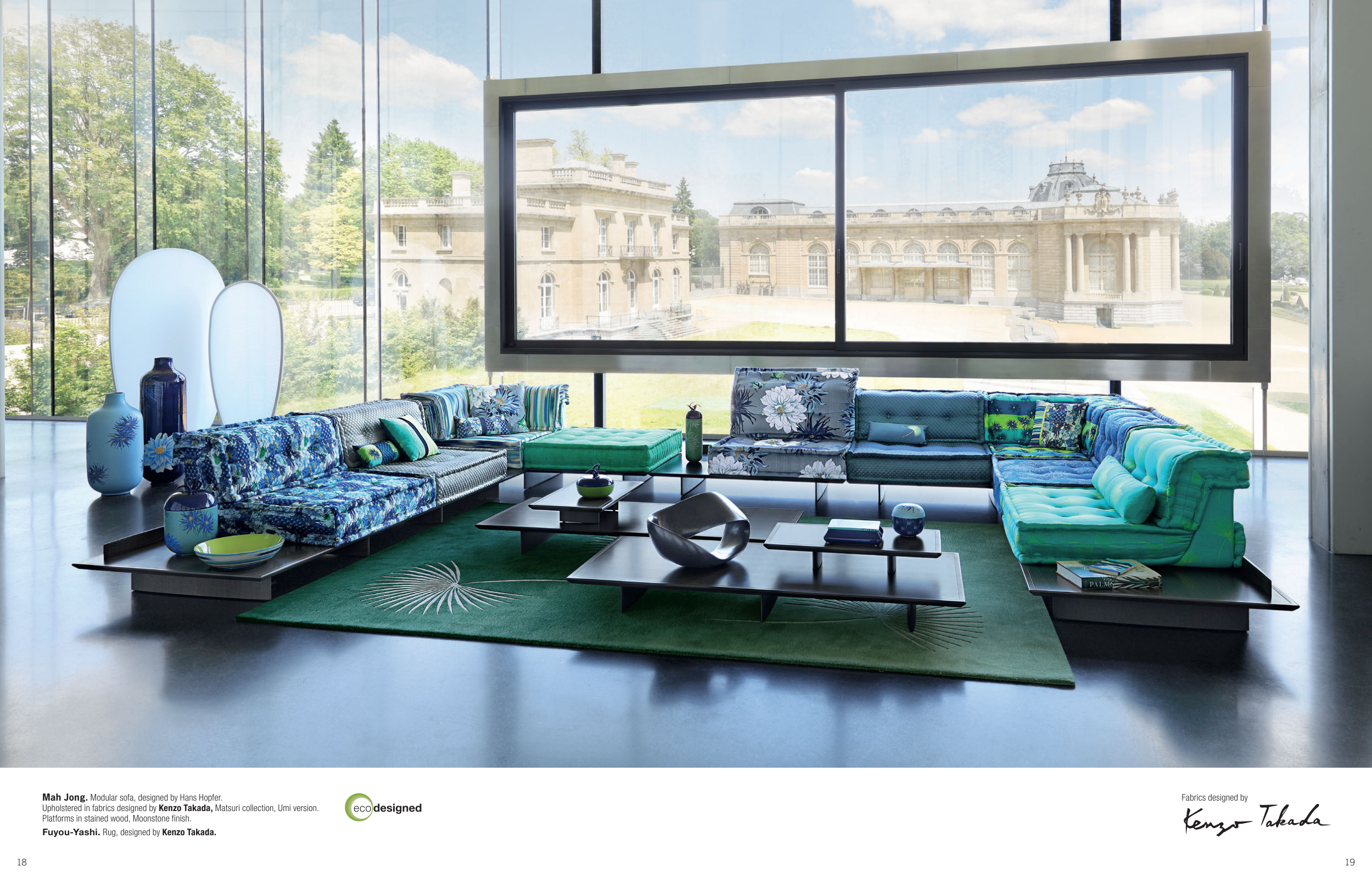 Upholstered in fabrics designed by Kenzo Takada, Matsuri collection, Umi version.