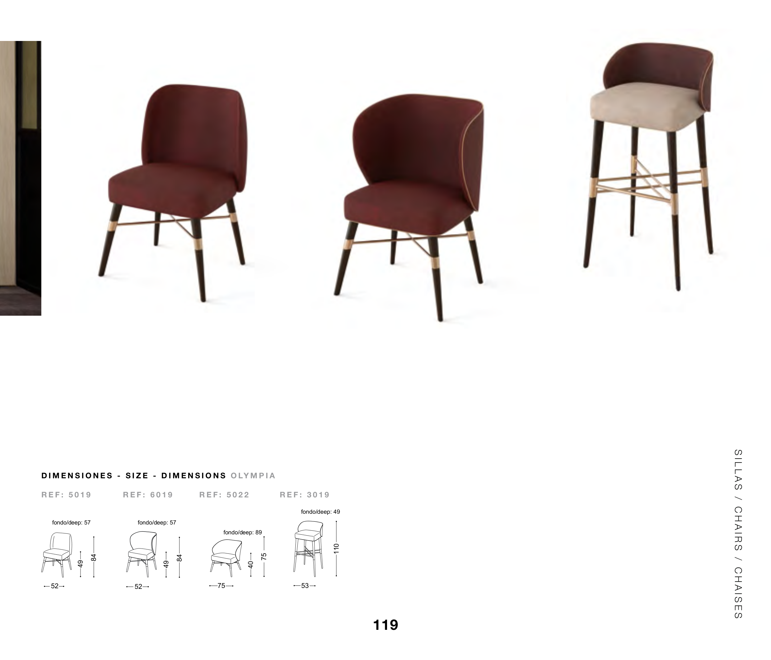 S I L L A S / C H A I R S / C H A I S E S D I M E N S I O N E S - S I Z E - D I M E N S I O N S O LY M P I A R E F : 5 0 1 9 R E F : 5 0 2 2 R E F : 6 0 1 9 R E F : 3 0 1 9 fondo/deep: 57 52 49 84 fondo/deep: 57 52 49 84 fondo/deep: 89 75 40 75 fondo/deep: 49 53 110 119